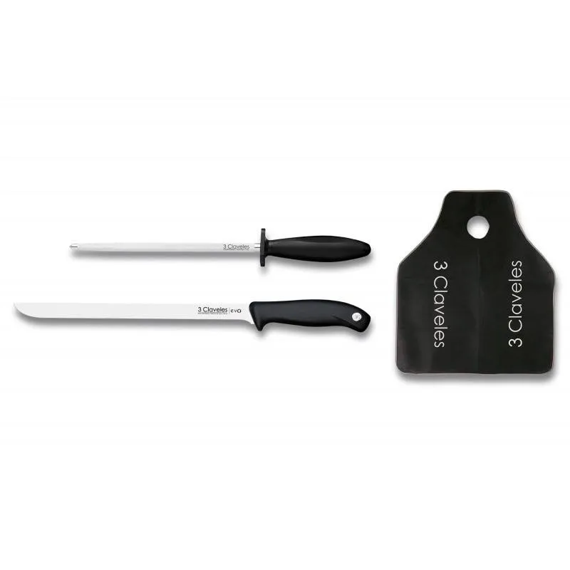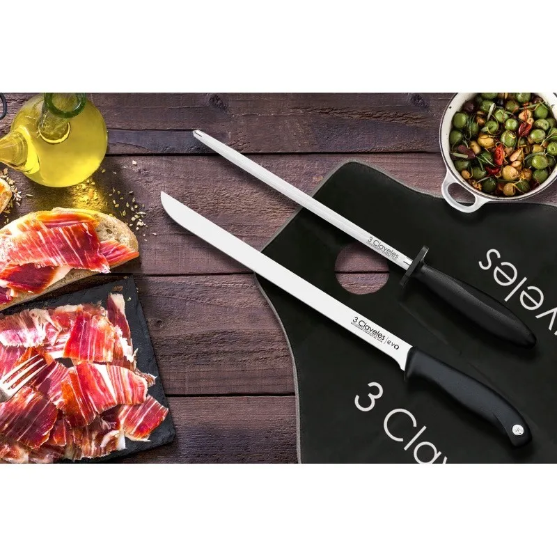 Juego de cuchillo jamonero y chaira 3 Claveles, con regalo de cubre jamón