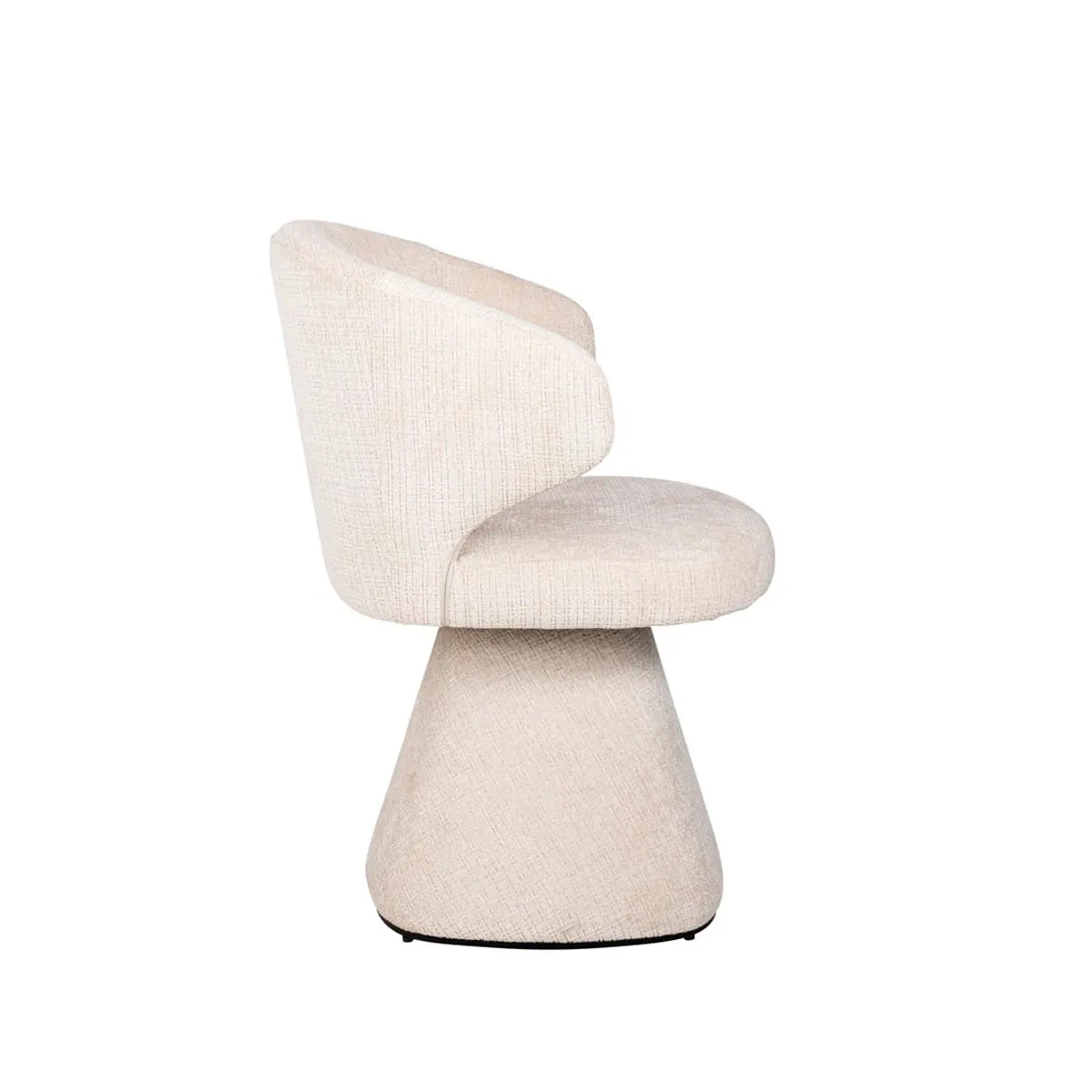 Silla Zendaya con base trapezoidal tapizad en chenilla beige.