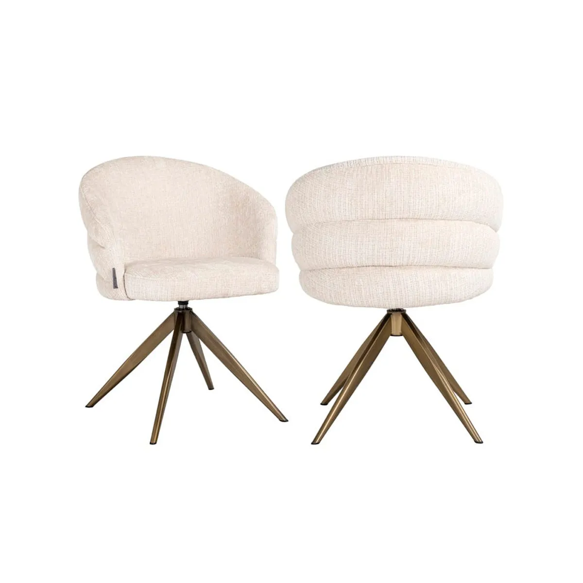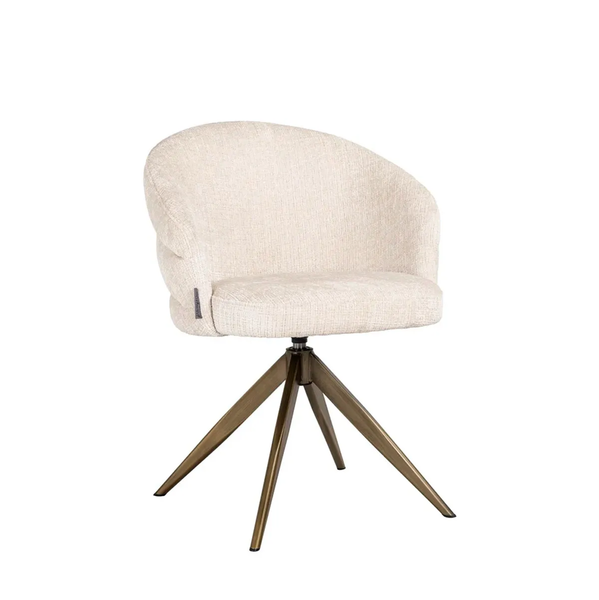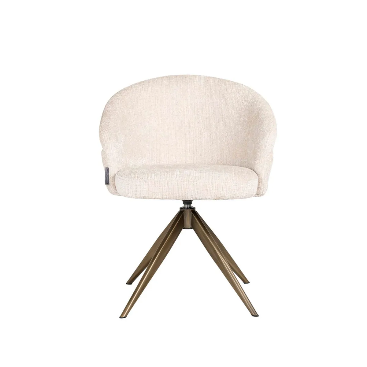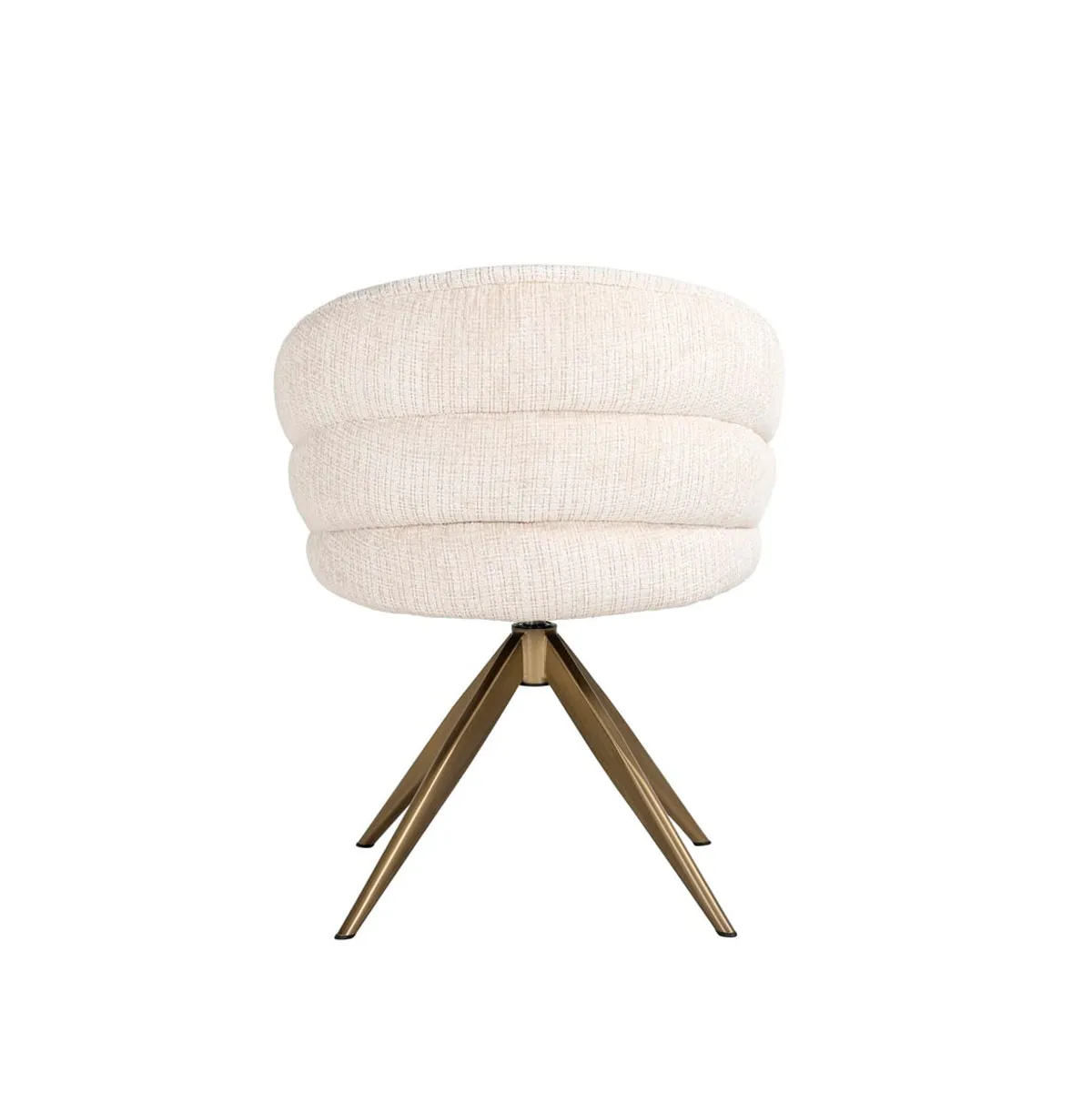 Silla Zendaya con base giratoria dorada tapizad en chenilla beige.