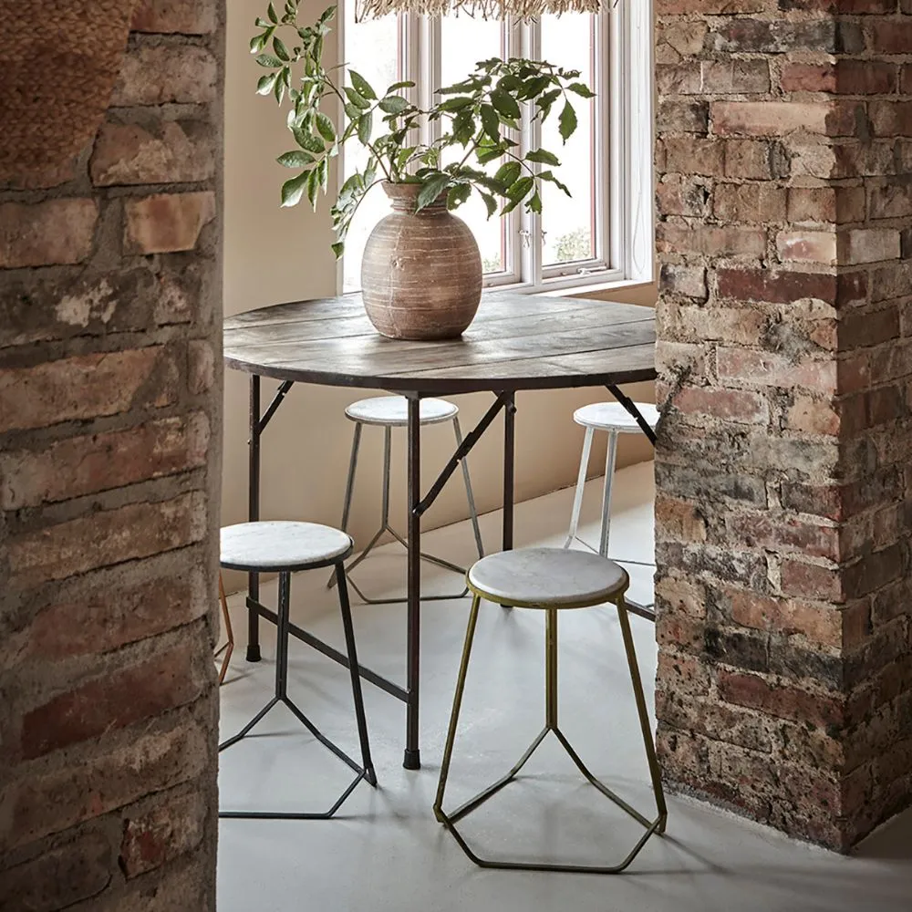 El taburete/mesa auxiliar Marelo de la marca Affari of Sweden está fabricado con una superficie de mármol blanco que aporta estabilidad y una estructura de metal con acabado envejecido que le aporta carácter. Gracias a su diseño, es fácilmente apilable y permite un almacenamiento sencillo, siendo ideal tanto como asiento adicional como mesa auxiliar.
