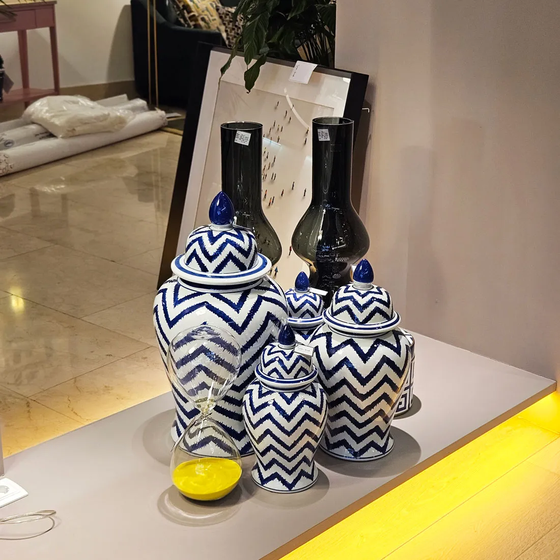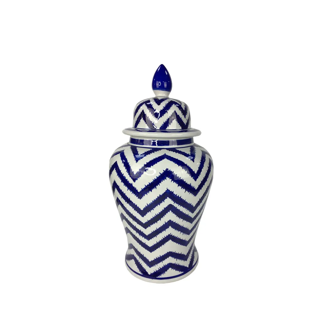 Tibor grande con tapa de cerámica con dibujo de chevron (o espiga) en color azul y blanco.