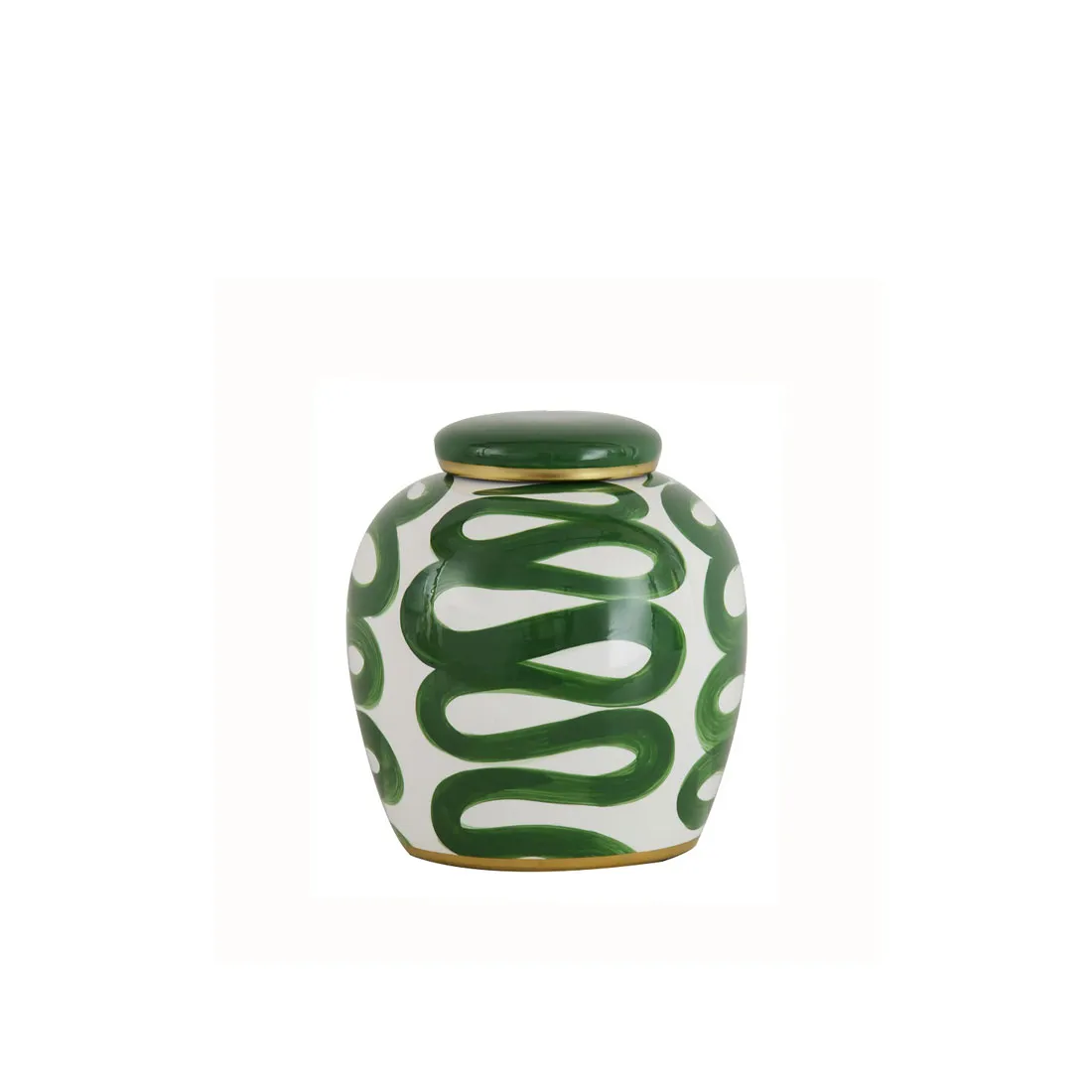 Tibor Serpentine con tapa de cerámica con dibujo en colores verde y blanco.