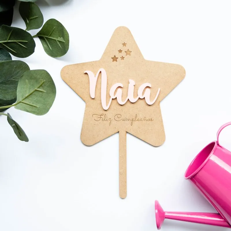 Topper con forma de estrella en Madera MDF con la inscripción «Feliz Cumpleaños» grabada y el nombre personalizado en relieve acrílico, ideal para decorar tartas, mesas dulces u otros espacios en eventos y celebraciones. Puedes seleccionar el nombre que quieras en tu color preferido, que va pegado encima de la base de madera en relieve.