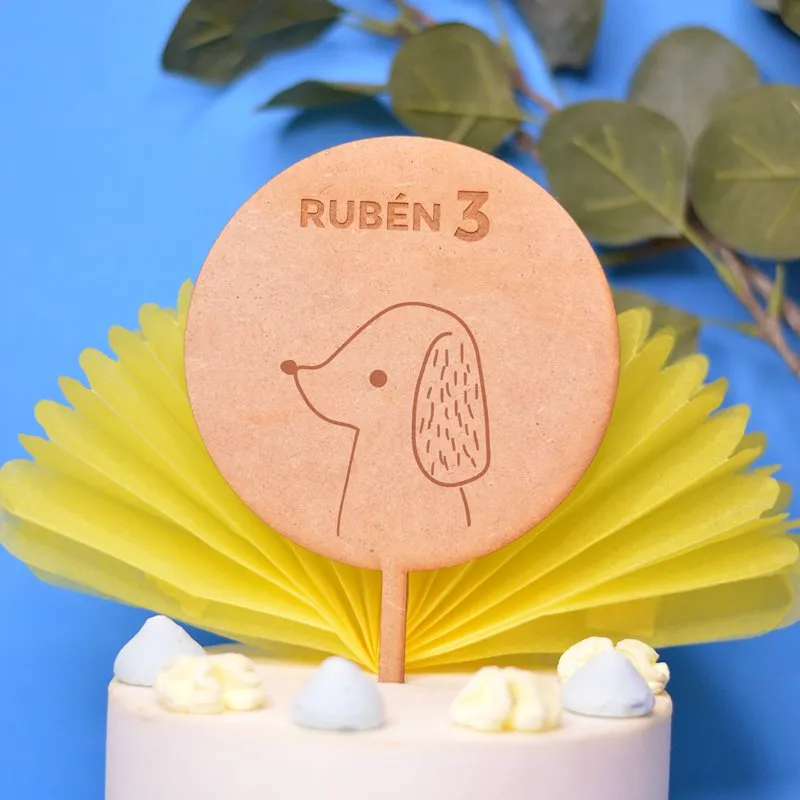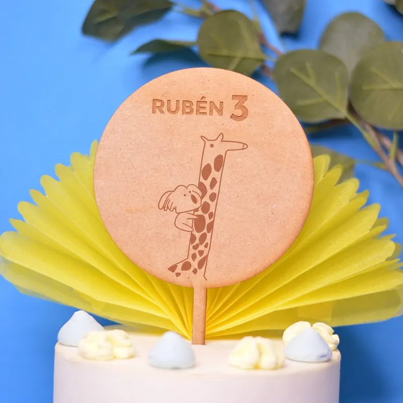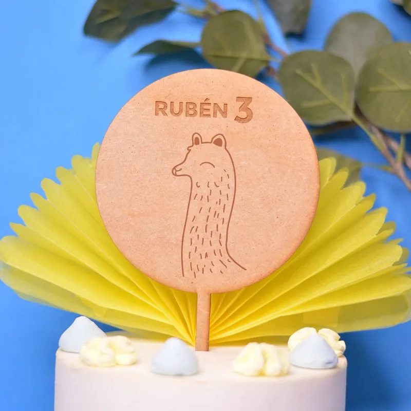 Topper circular en Madera MDF con diseño de animales a elegir entre los del desplegable (ver fotos) y personalizado con el texto que quieras: nombre y edad, sólo nombre, tu frase favorita…