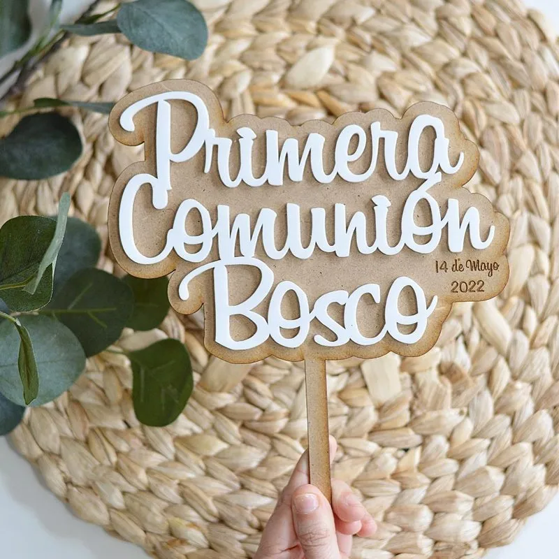 Nuestro topper personalizado para Primera Comunión tiene una base de madera MDF con el texto en relieve en acrílico de color a elegir entre más de 40 opciones. También puedes incluir la fecha grabada en la madera y guardarlo para siempre como recuerdo de un día tan especial y bonito.