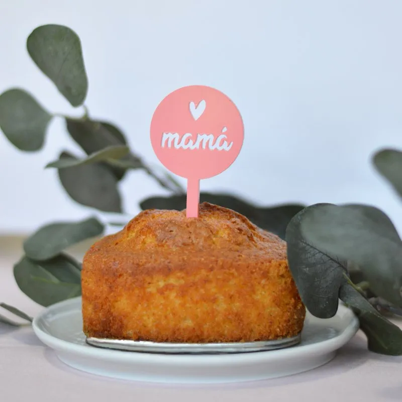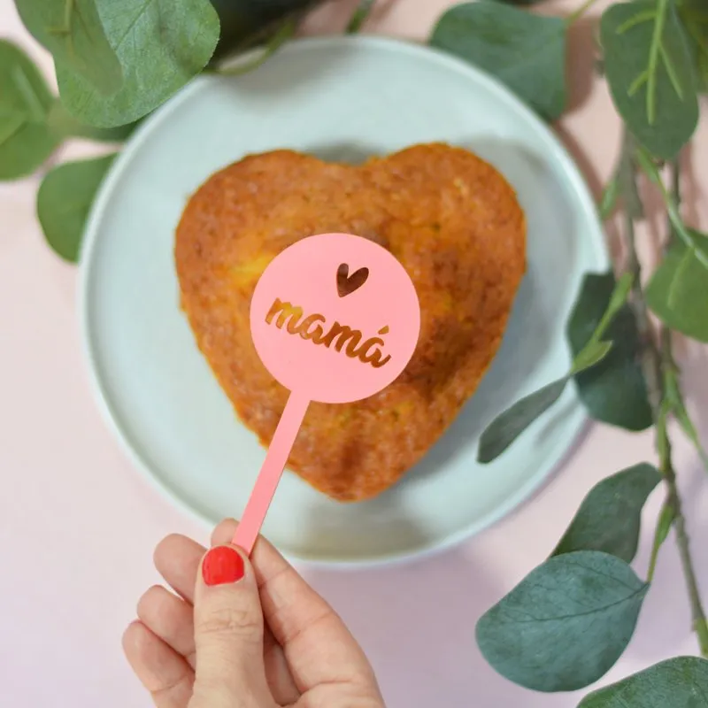 Topper especial con la palabra MAMÁ y un corazón calados en un círculo, para hacer aún más especial el Día de la Madre y demostrarle todo lo que la quieres. También puedes incluir un mensaje personalizado en una tarjeta para enviarlo como regalo, indicándolo en los comentarios del pedido, al final del proceso de compra.