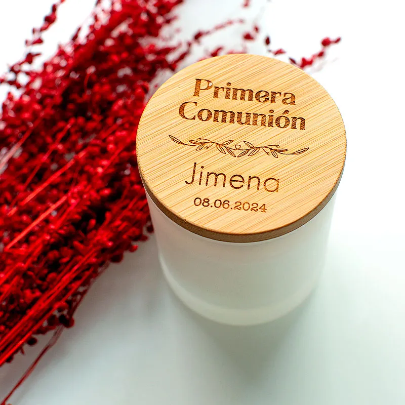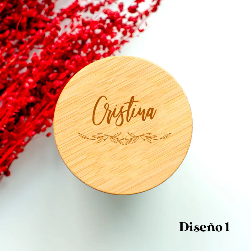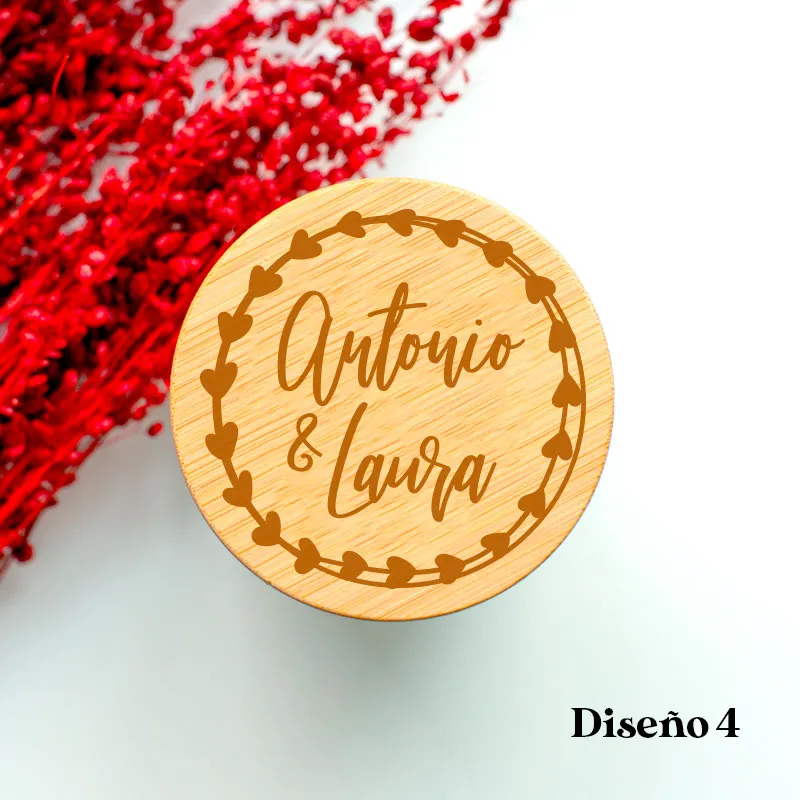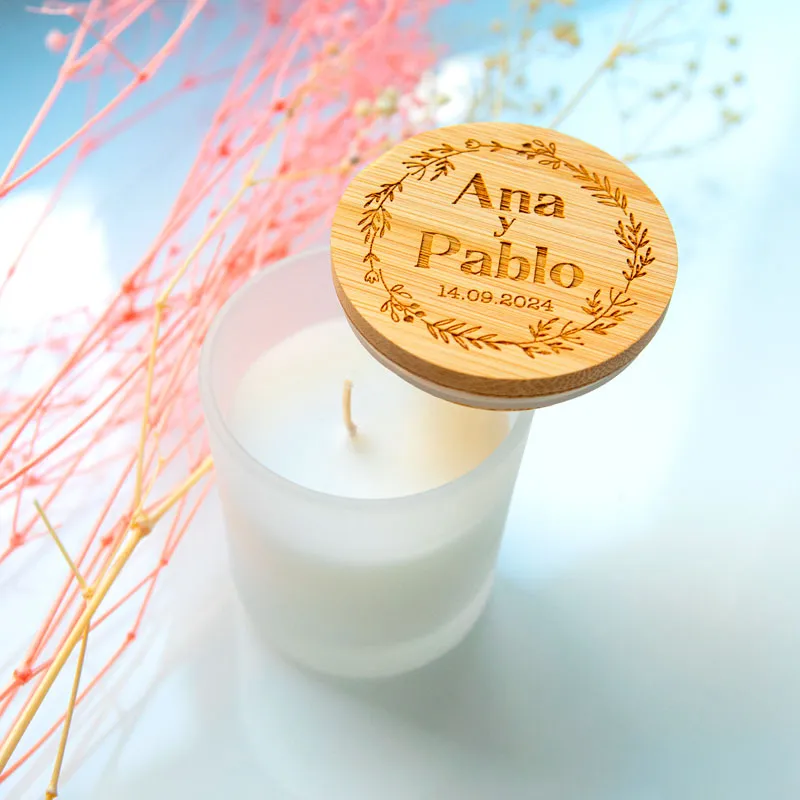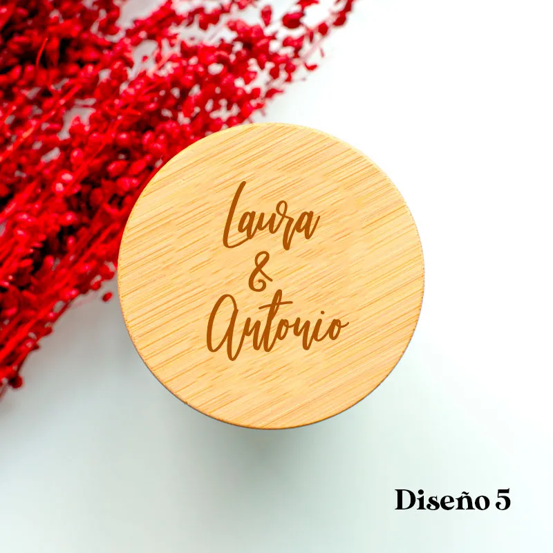 Están fabricadas en cristal ahumado en color blanco, con tapa de bambú grabada que puedes personalizar con diferentes diseños y tipos de letra (ver fotos). También podemos grabarla con tu propio diseño, que puedes enviarnos adjuntando la imagen donde lo indica.