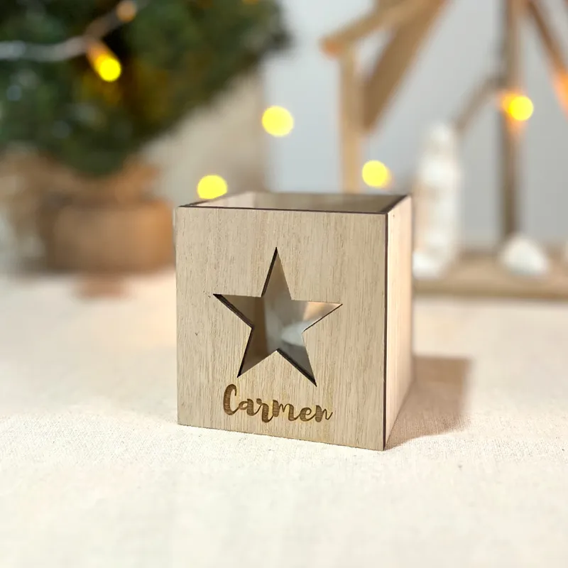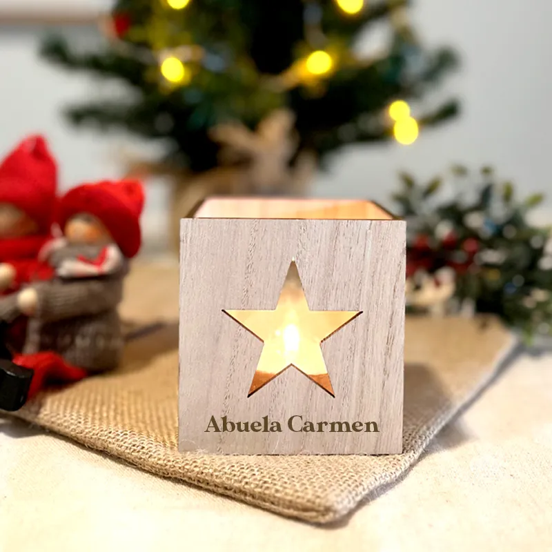 Fabricada en madera troquelada con una estrella, incluye un soporte de cristal y una vela de té en su interior.