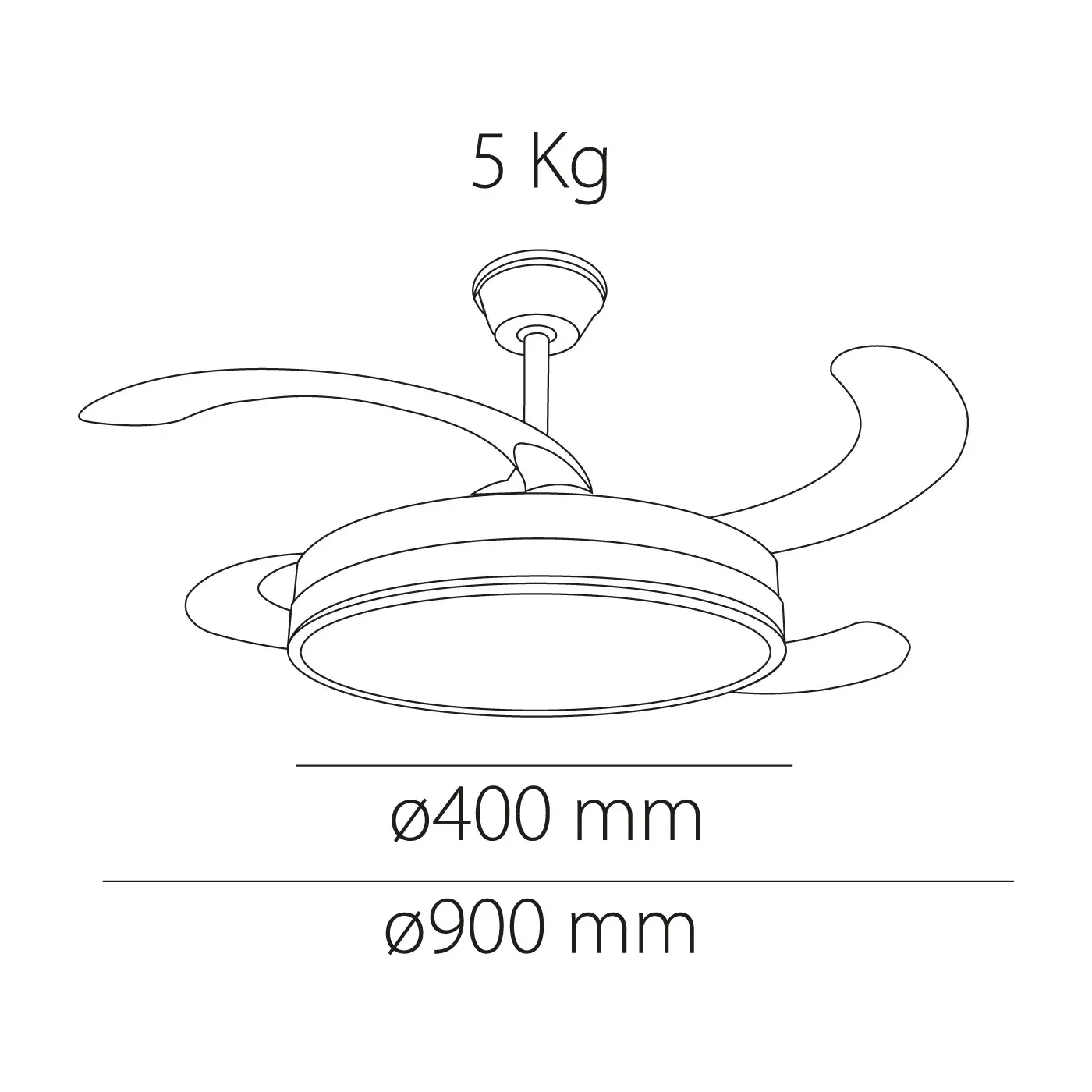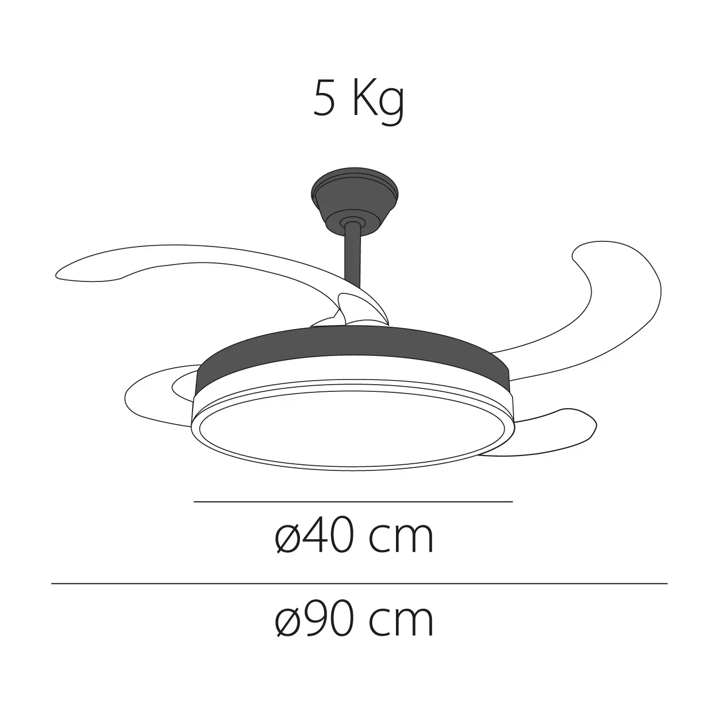 Dimensiones y rendimiento: Diámetro cerrado: 40 cm. Diámetro con aspas abiertas: 90 cm. Ideal para estancias de 10 a 15 m².