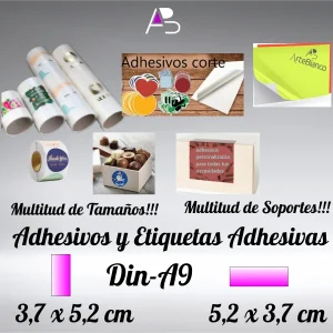 Adhesivos Din-A9, 3,7 x 5,2 cm, en papel flúor o Neón, impresión con tinta negra