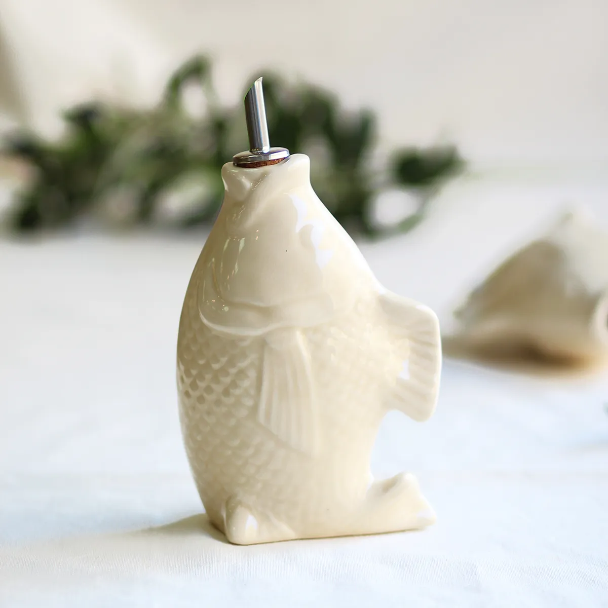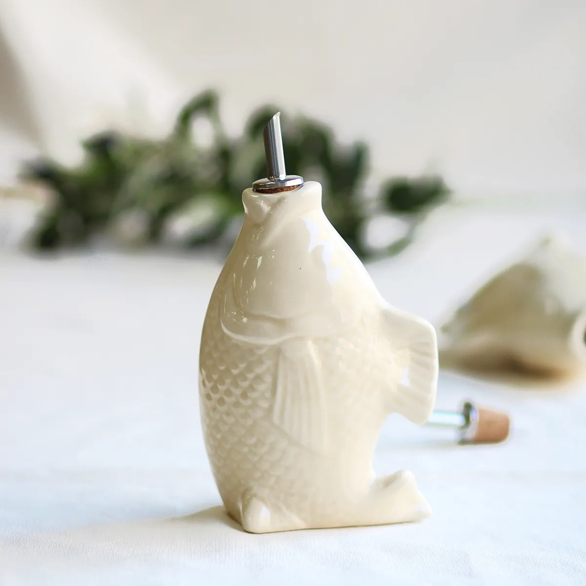 Esta aceitero o vinagrero con forma de pez forma parte de un tipo de cerámica tradicional del centro de Portugal. Este tipo de vajilla con formas es ya un símbolo tradicional del país luso y el tema marítimo está muy presente en sus mesas. Aunque está elaborada de forma artesanal, se trata de un producto adaptado y fabricado para el uso diario.