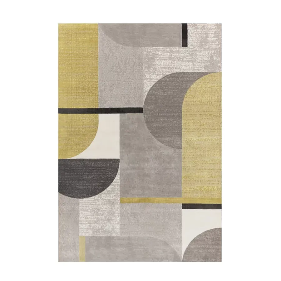 Alfombra gris con diseño años 70 en mezcla de color gris y amarillo realizada en polyester y decolán. Textura suave y mullida, similar a la lana.