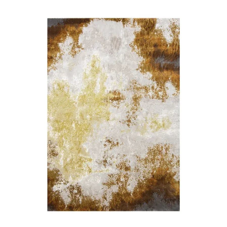 Alfombra con diseño abstracto en color naranja y ocre. Realizada en polyester y decolán. Textura suave y mullida, similar a la lana.