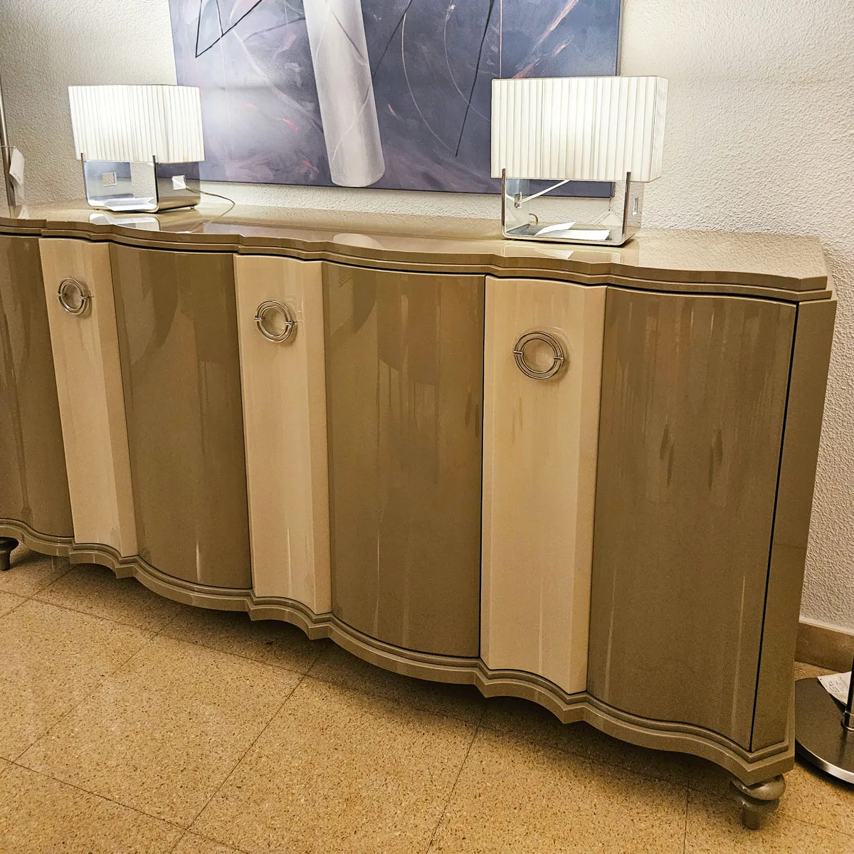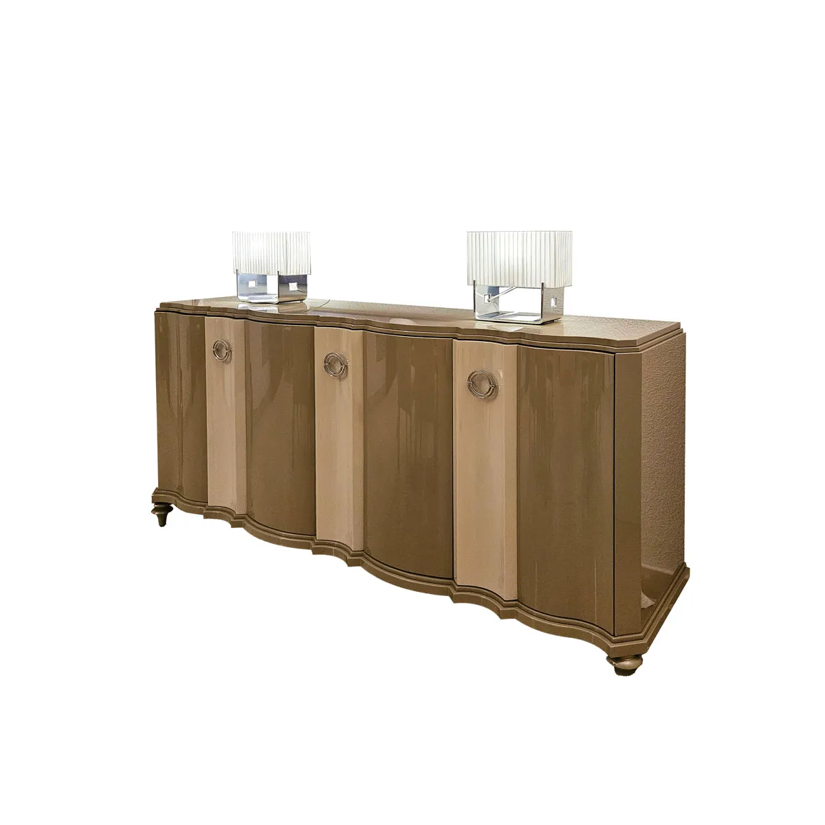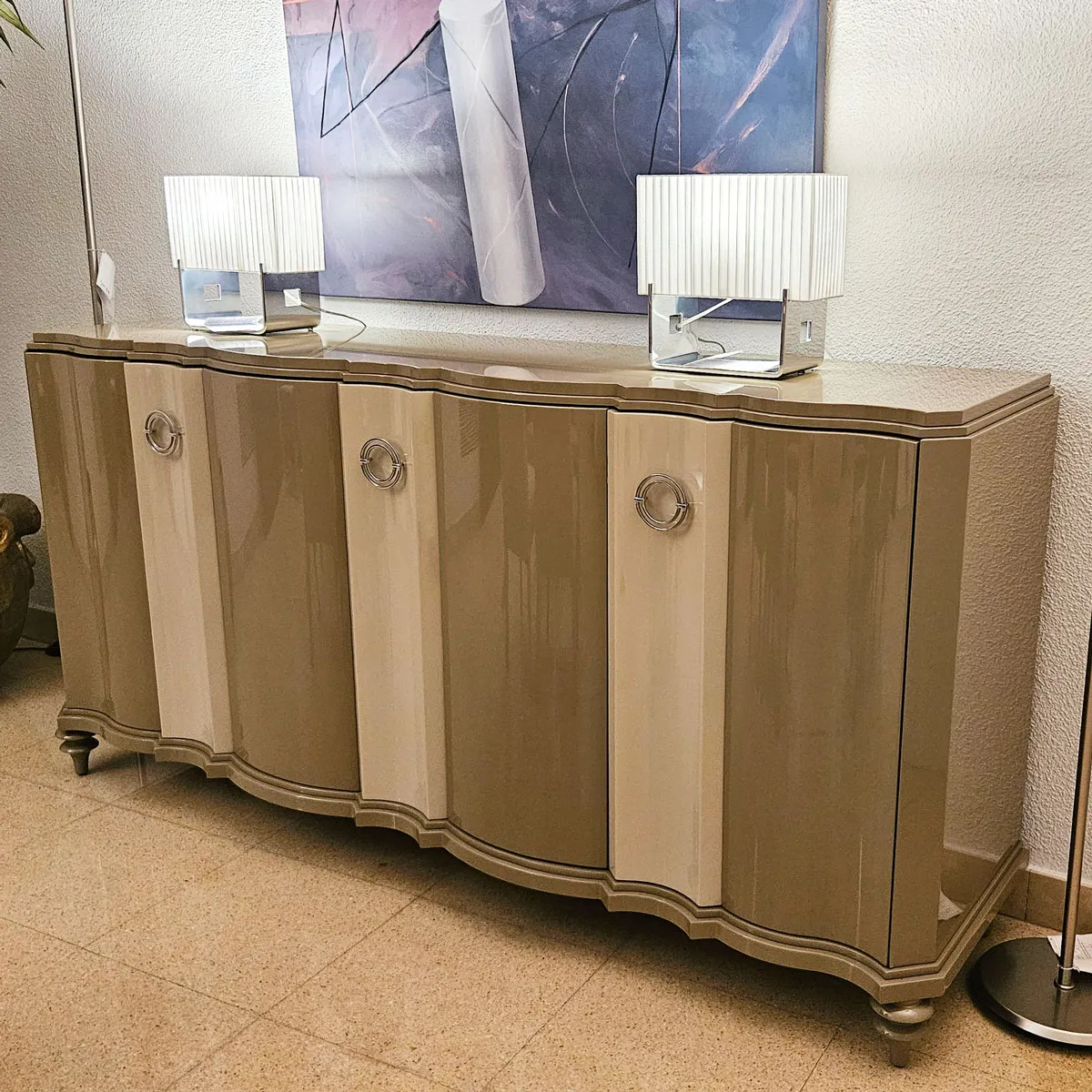 Aparador con puertas de la colección Savoy de Mobilfresno realizado en laca brillo en dos tonos en tiradores de acero.