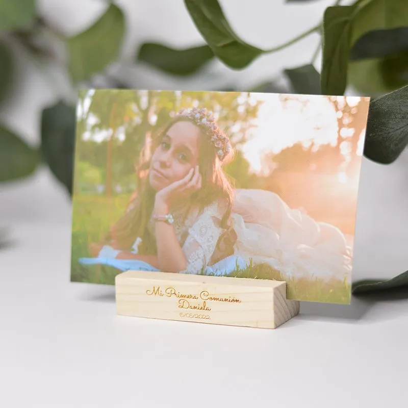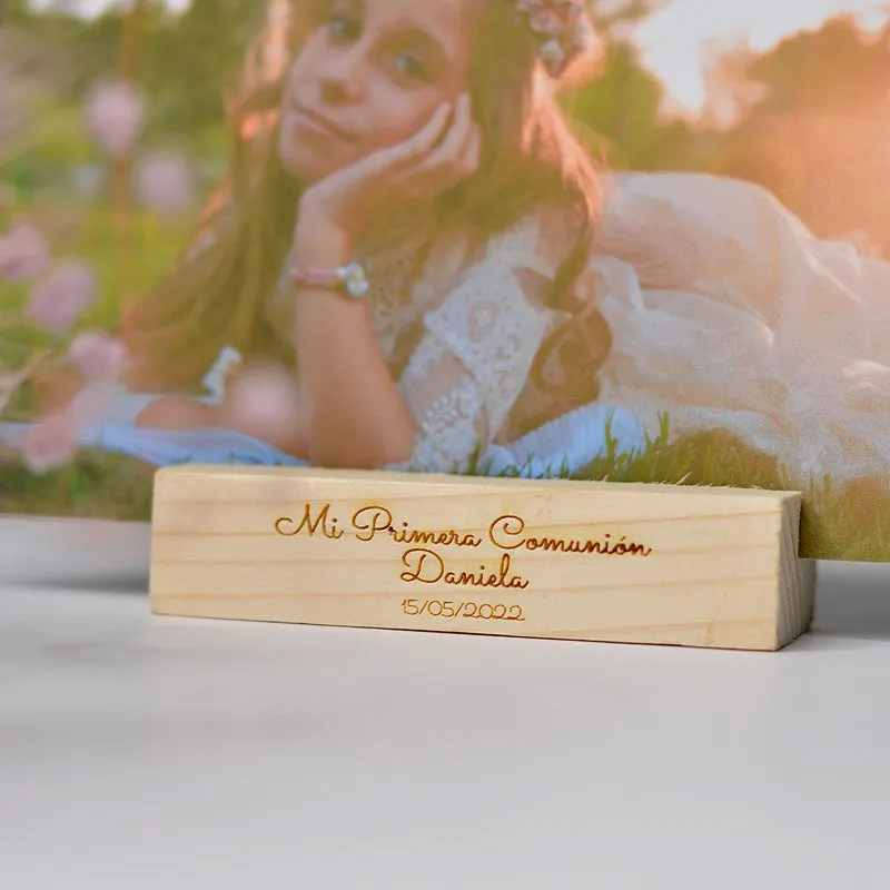 Base de madera natural personalizada con la frase, nombre y/o fecha grabada en la misma.
