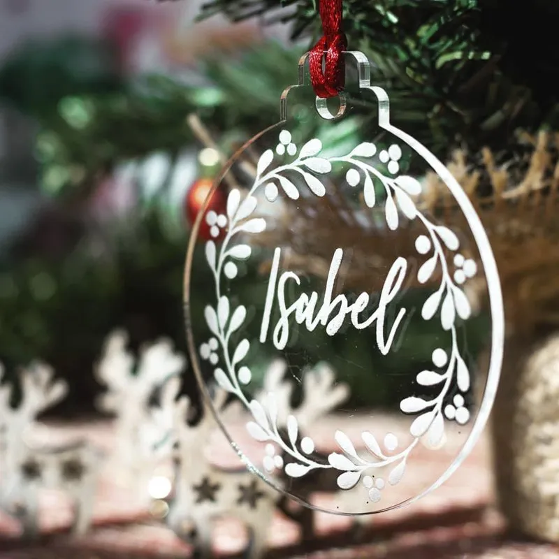 Sorprende a tus seres queridos, familiares y amigos con nuestra bola de Navidad personalizada. Bola de metacrilato transparente con nombre grabado y corona navideña grabada alrededor.