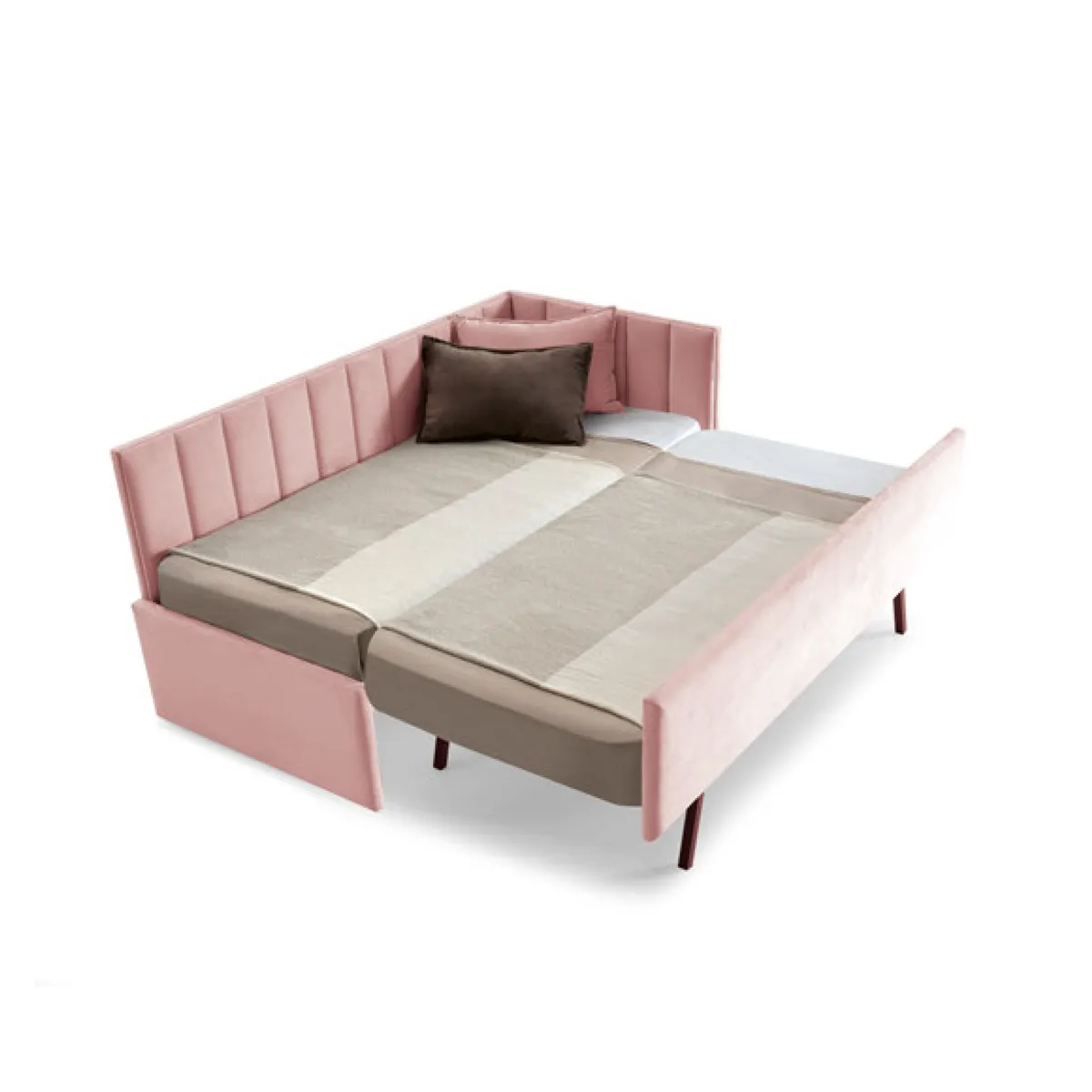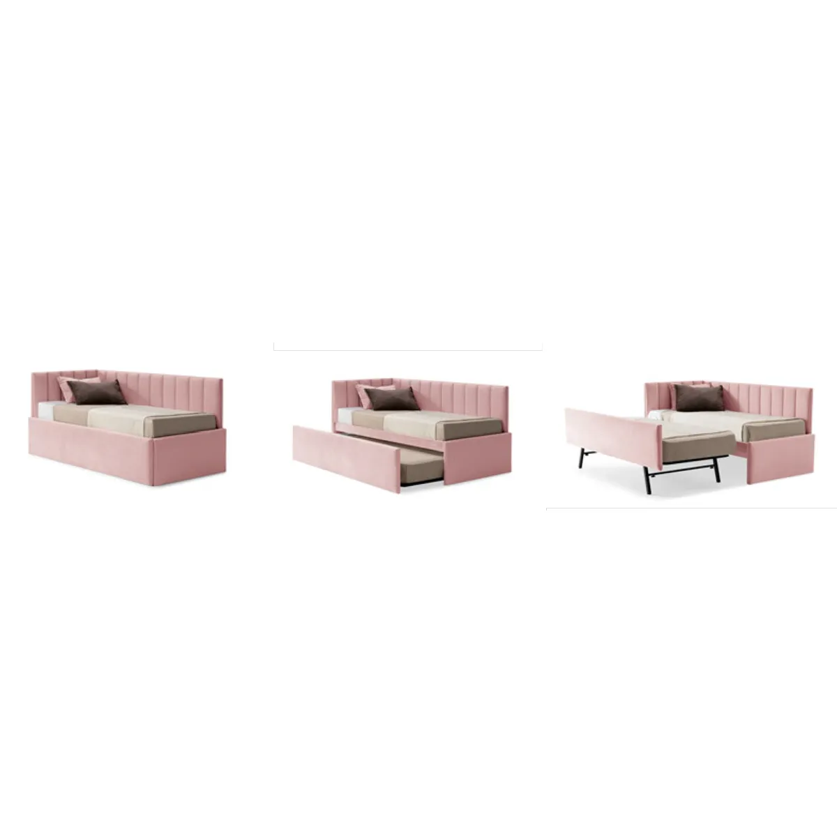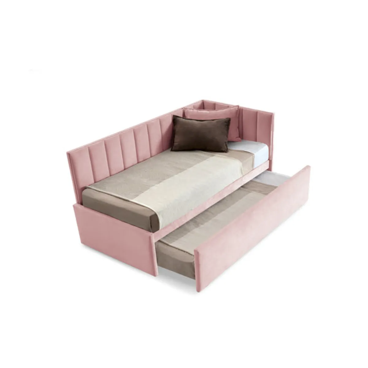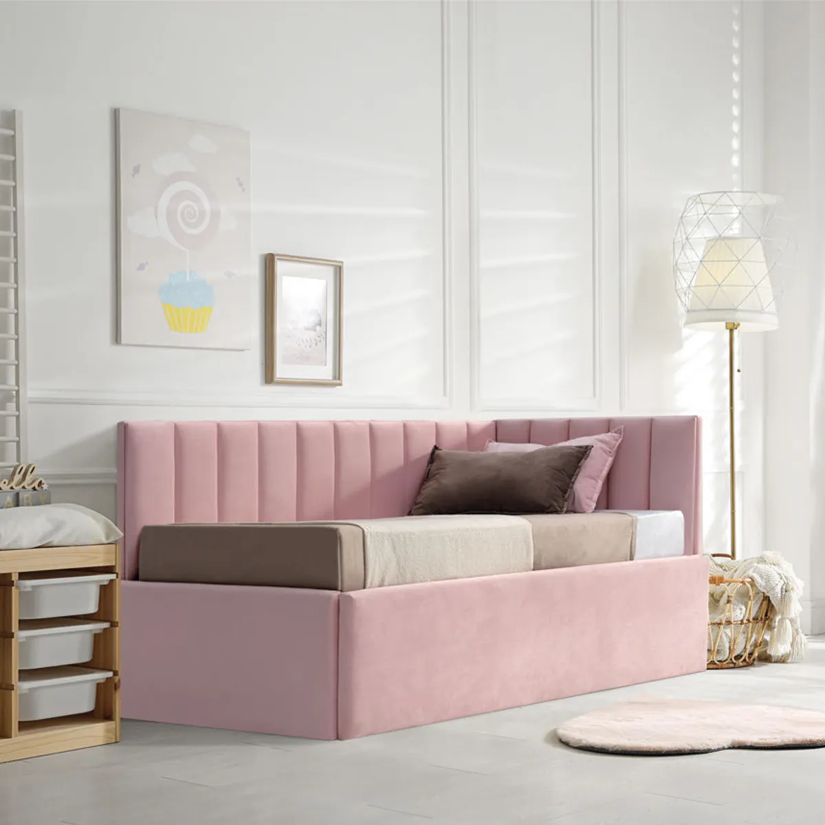 Cama nido infantil tapizada con diseño en esquina y trasera con divisiones verticales.