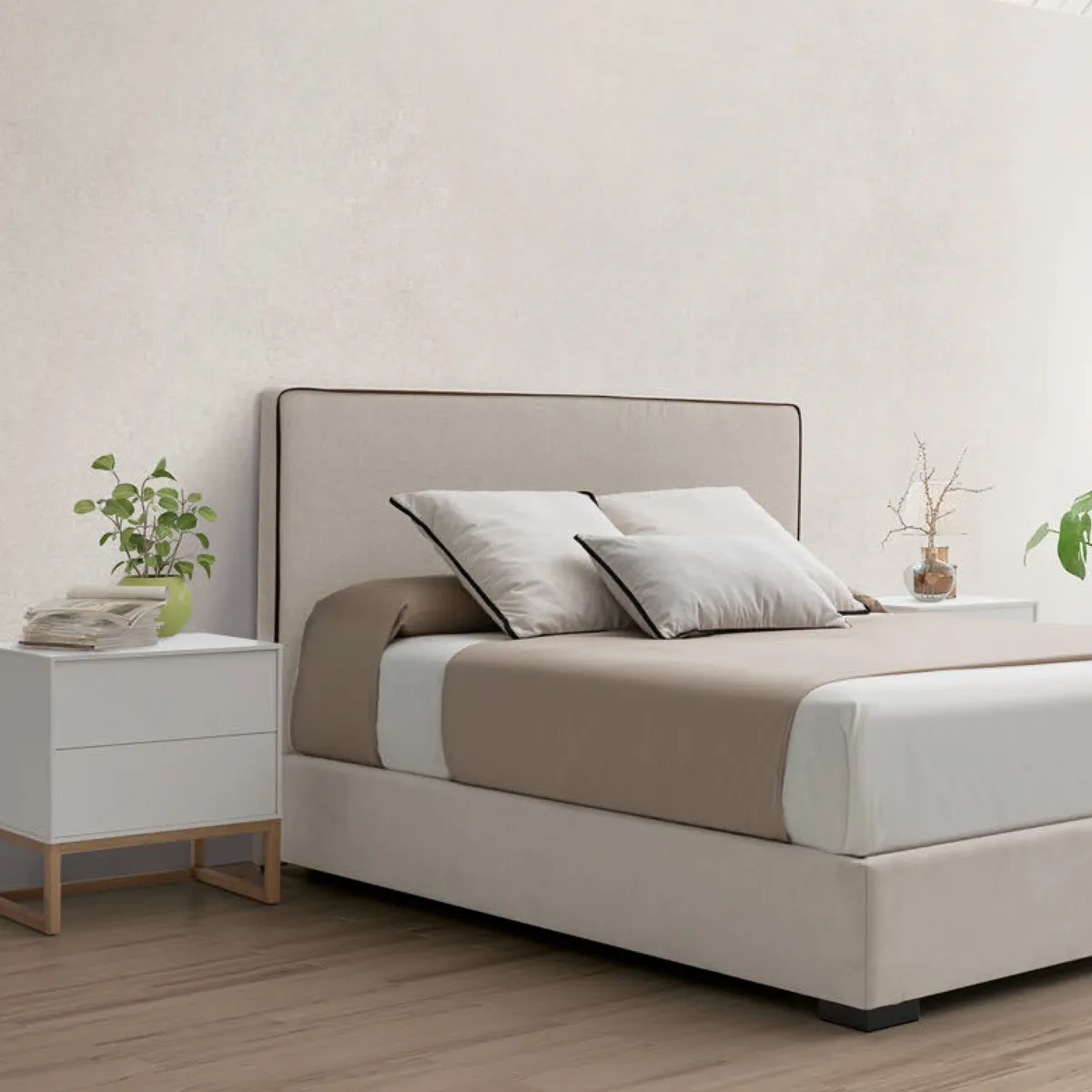 Un cabecero muy actual tapizado en liso con las esquinas redondeadas y un ribete perimetral.