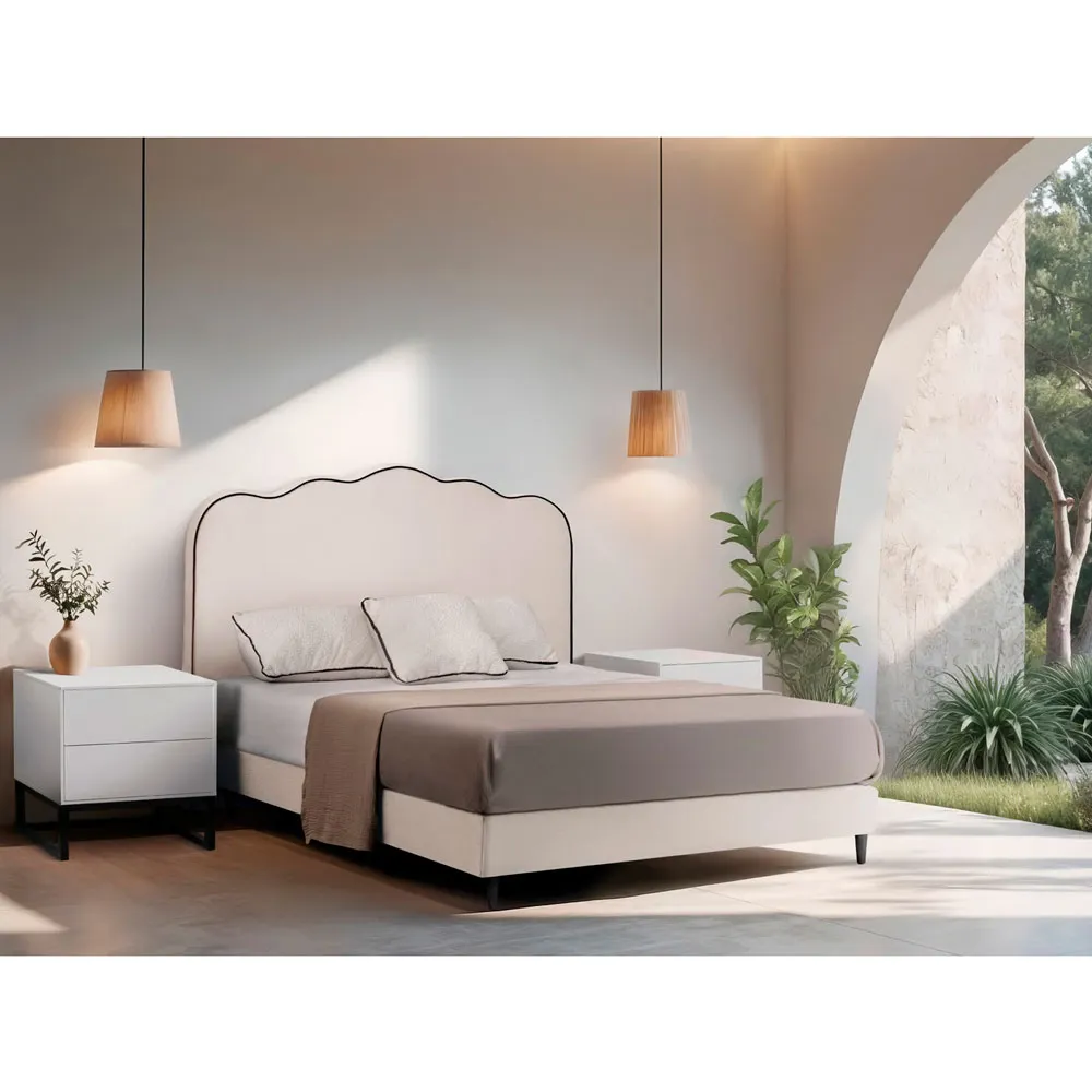 Nuestro cabecero Ondas tiene un diseño muy especial, está tapizado en liso con una sucesión de formas redondeadas en la parte superior y un ribete perimetral a escoger entre 5 colores.
