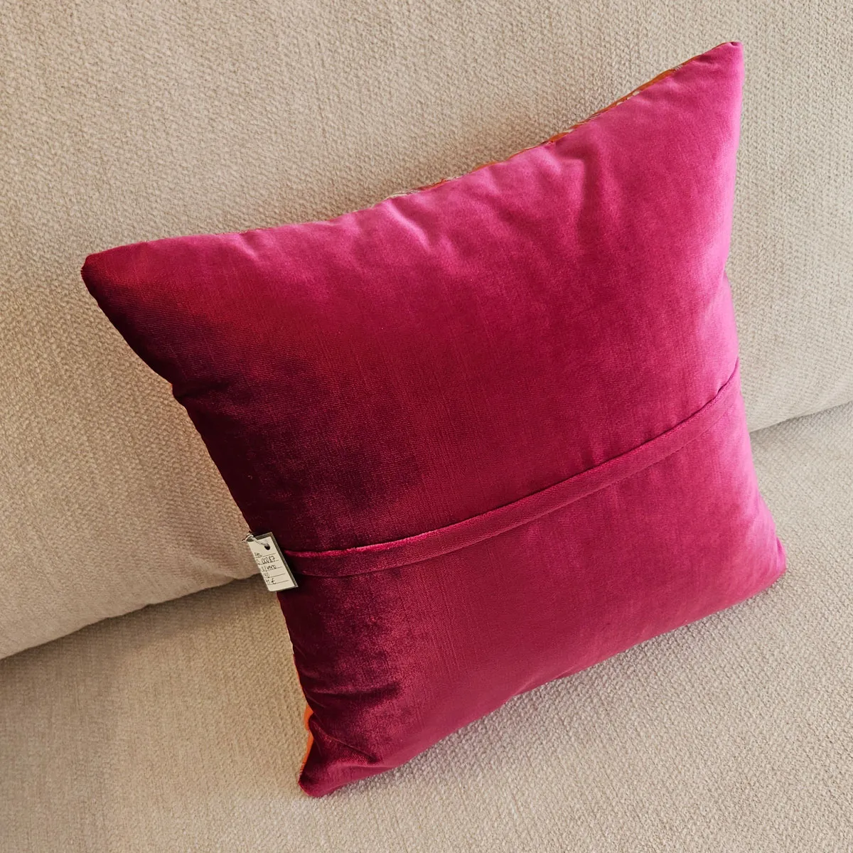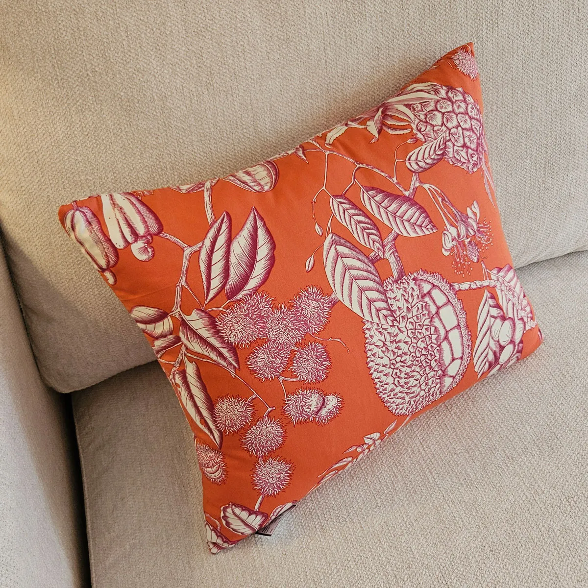 Cojines confeccionados con Balangan de Manuel Canovas, una vibrante tela 100% algodón con motivos en naranja y rosa.