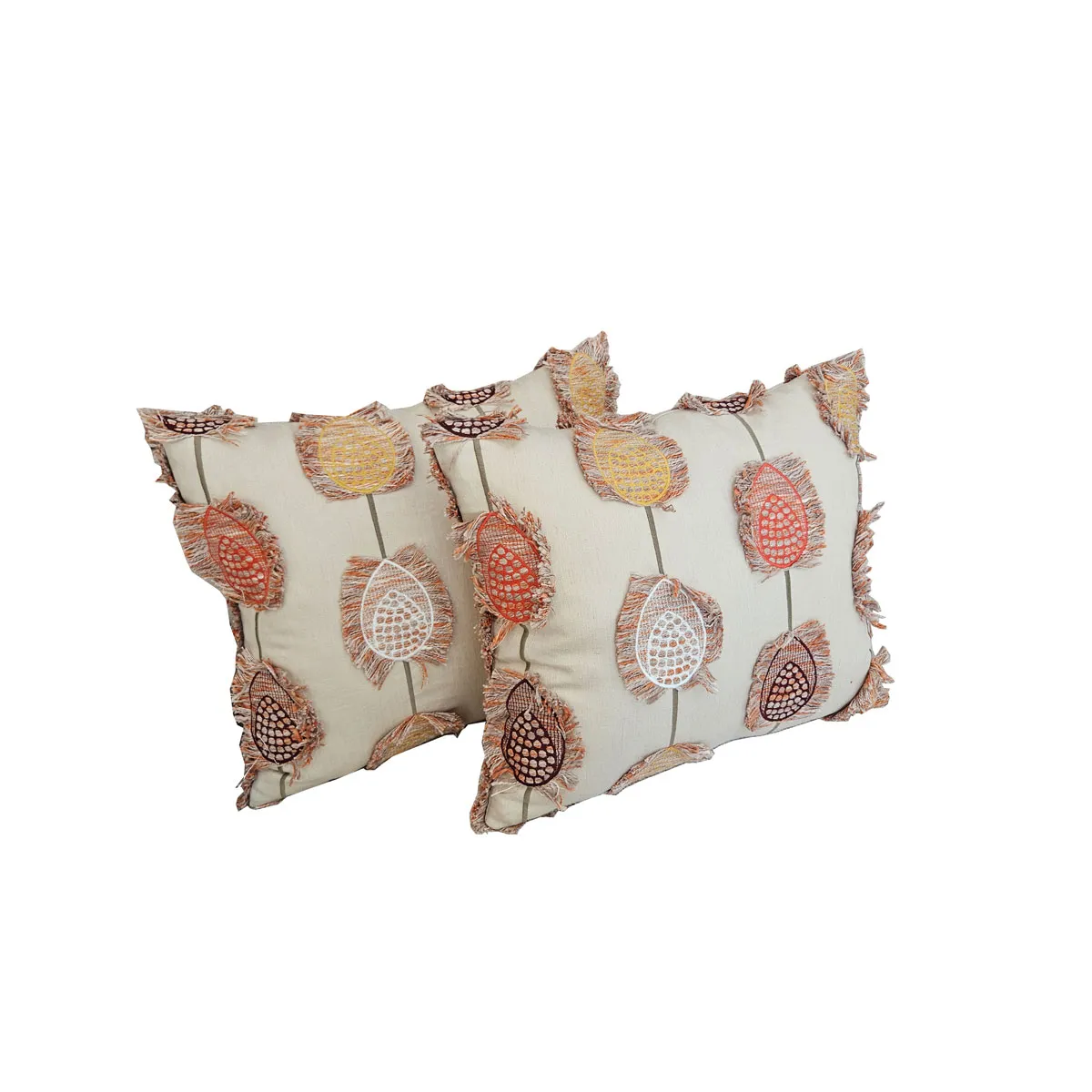 Cojín rectangular de 60*40 cm confeccionado con tela Allegro de Wind con base de lino y amebas bordadas con flecos en tonos tierra y naranja.