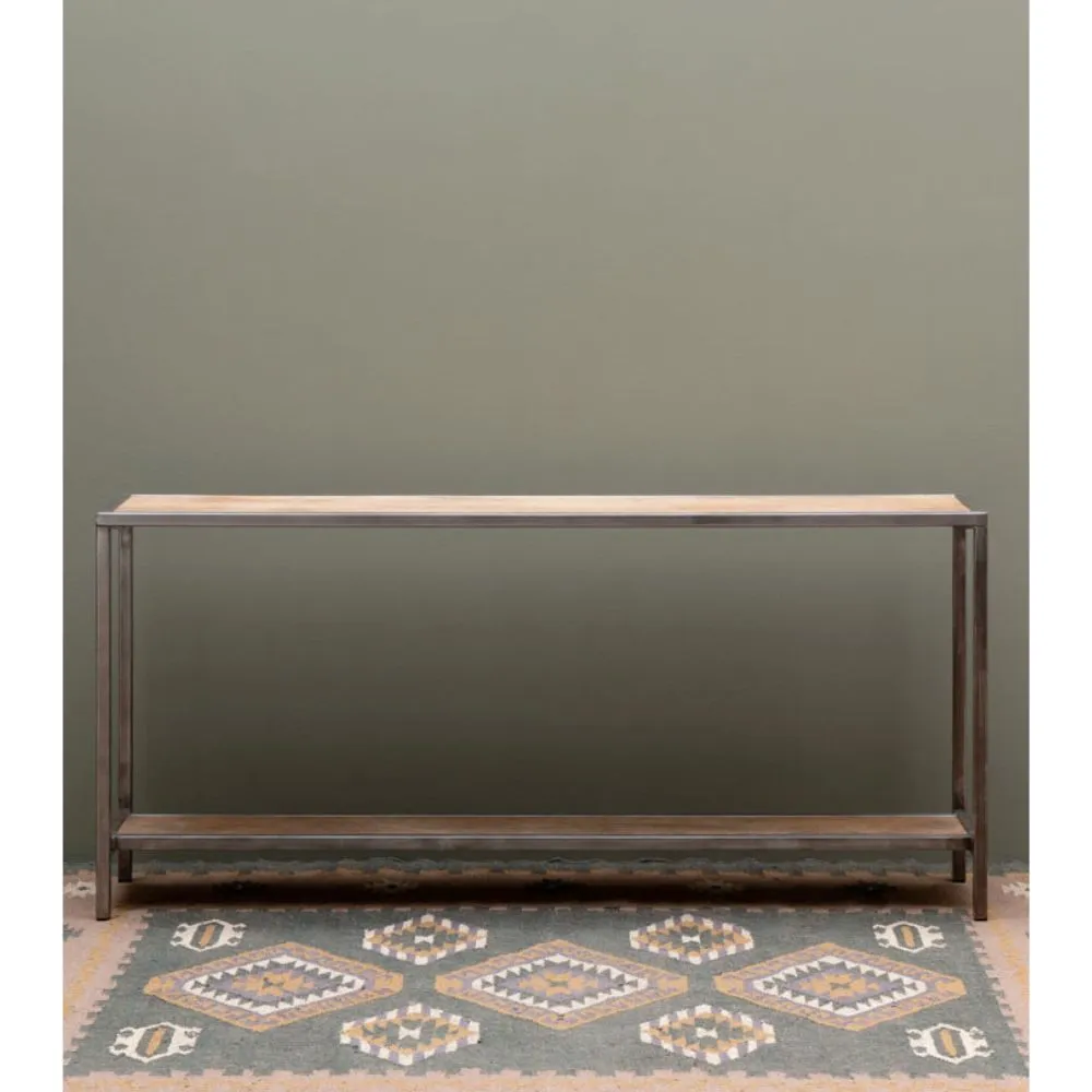La consola Bridge de la marca Chehoma es una elegante pieza que combina madera de mango y metal, perfecta para recibir invitados en espacios reducidos como recibidores, pasillos estrechos o traseras de sofás. Su altura ideal y el diseño en una sola pieza metálica aportan estabilidad y un toque moderno. El acabado en plata envejecida proporciona una pátina distintiva que realza su estilo y la convierte en un mueble versátil para cualquier hogar.