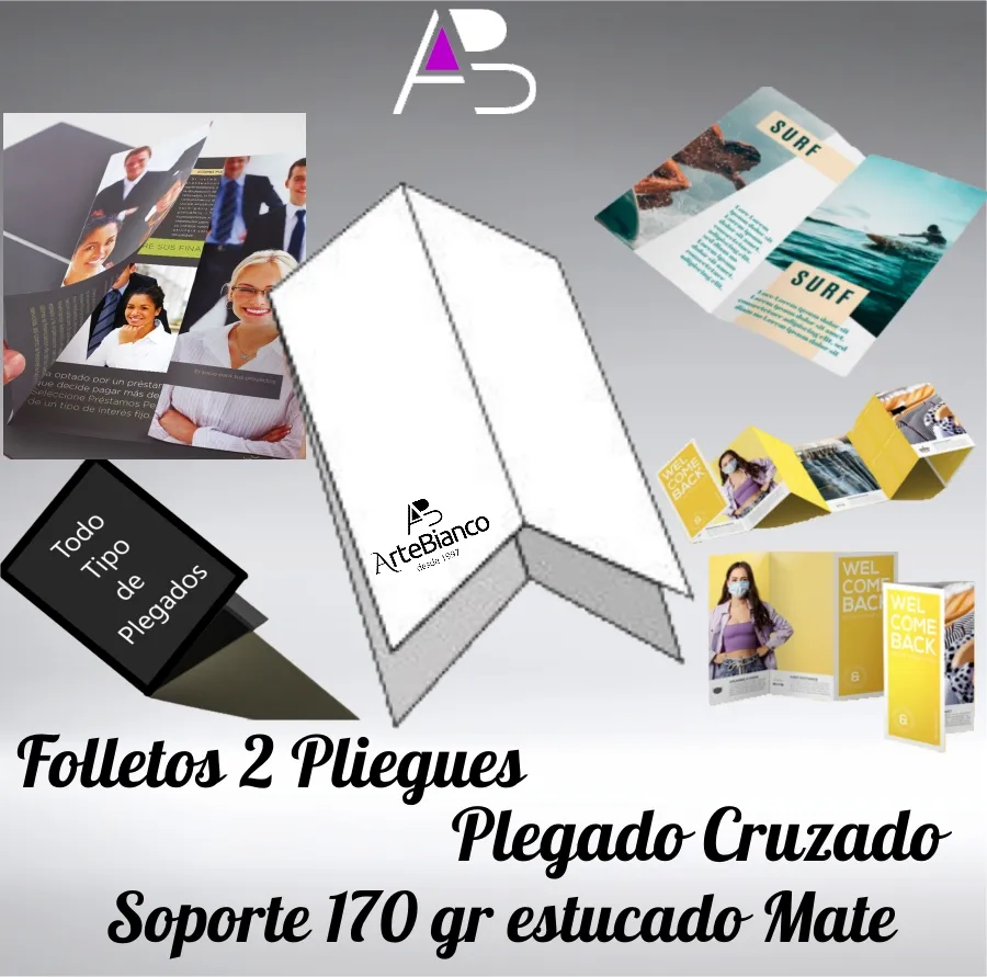 Folletos con 2 pliegues, plegado Cruz, en papel estucado mate de 170 gr impresión cuatricomía 2 caras