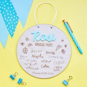 Fabricados en acrílico espejo con forma de estrella, círculo o corazón y nombre grabado con la tipografía de la imagen.