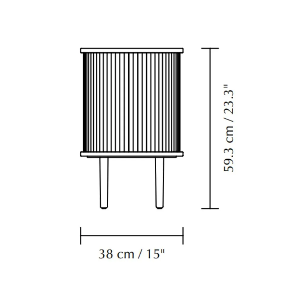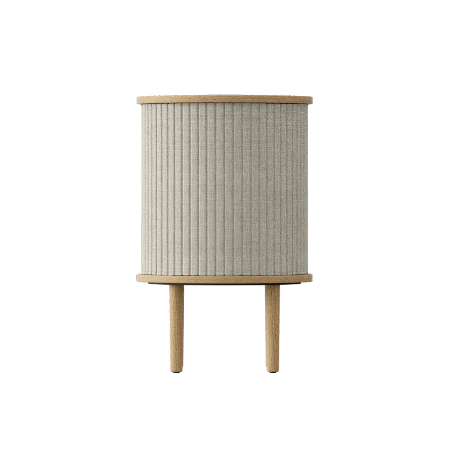 La mesa auxiliar Audacious de Umage es una mesa auxiliar que puede usarse a la perfección como mesita de noche. Su estructura de madera maciza con detalles en chapa de roble aporta un estilo cálido, mientras que su sistema de puertas correderas en tejido de poliéster en color blanco arena la posibilidad de ocultar o exhibir objetos según sea necesario. Con unas dimensiones de 38 cm de diámetro y 59 cm de altura, esta mesa es perfecta para colocar junto a un sofá o una cama, proporcionando almacenamiento práctico sin ocupar demasiado espacio.