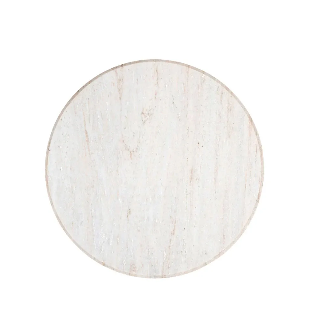 Mesa auxiliar redonda con patas de madera de mango oscuras y tapa de mármol jaspeado beige.