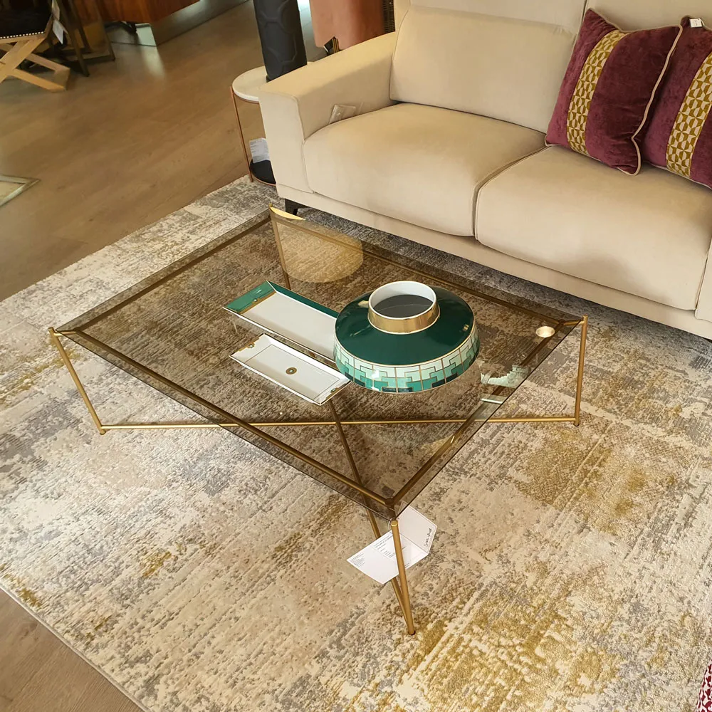 Mesa de centro con estructura de metal ligera en color dorado y tapa de cristal.