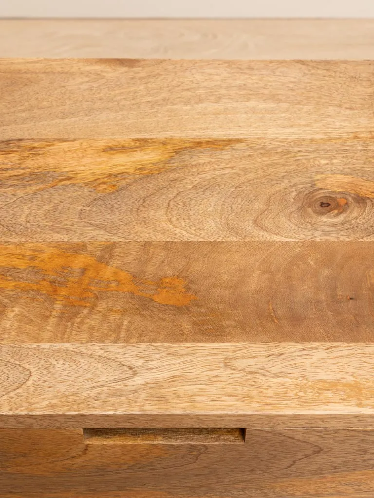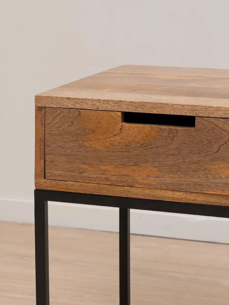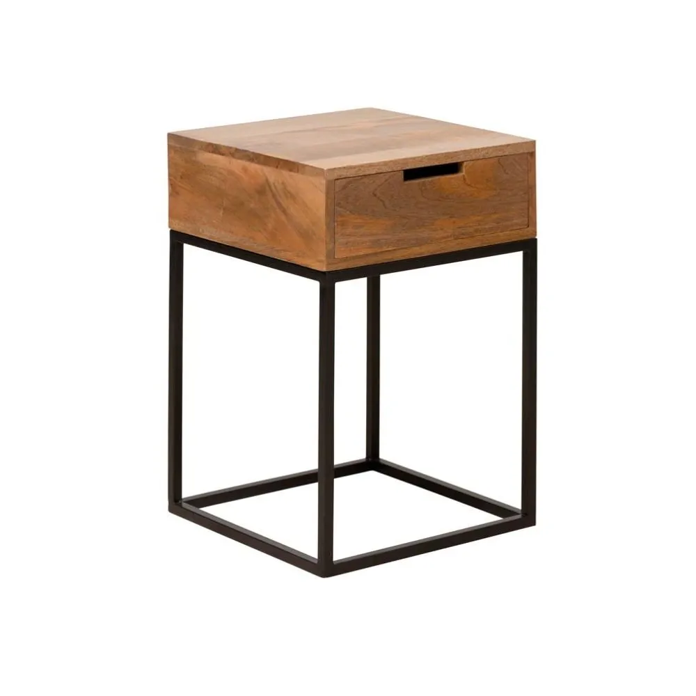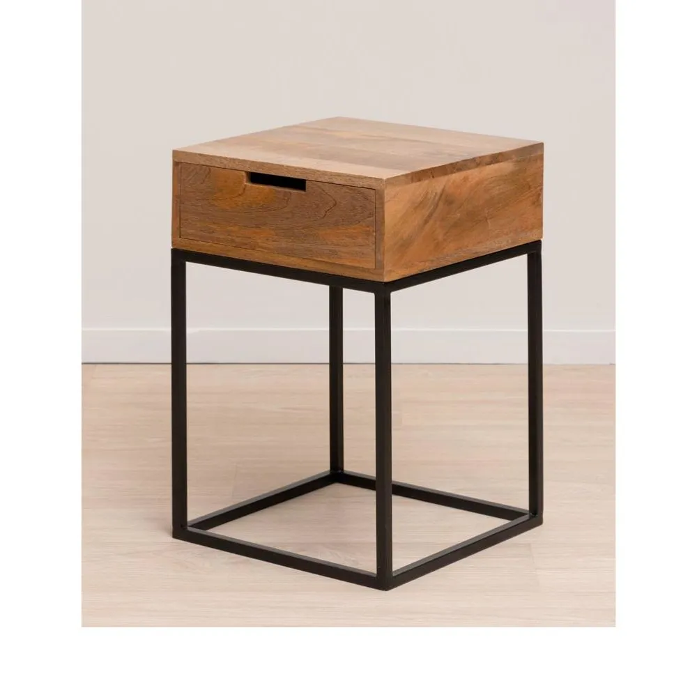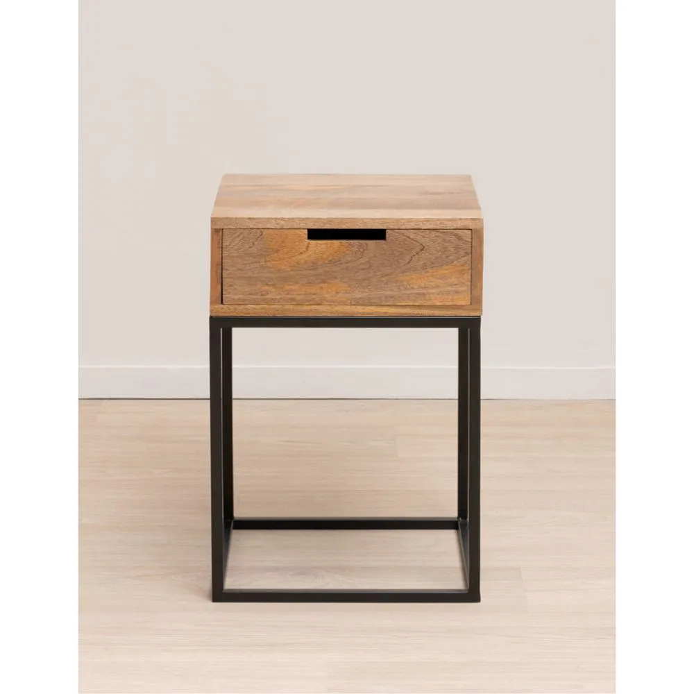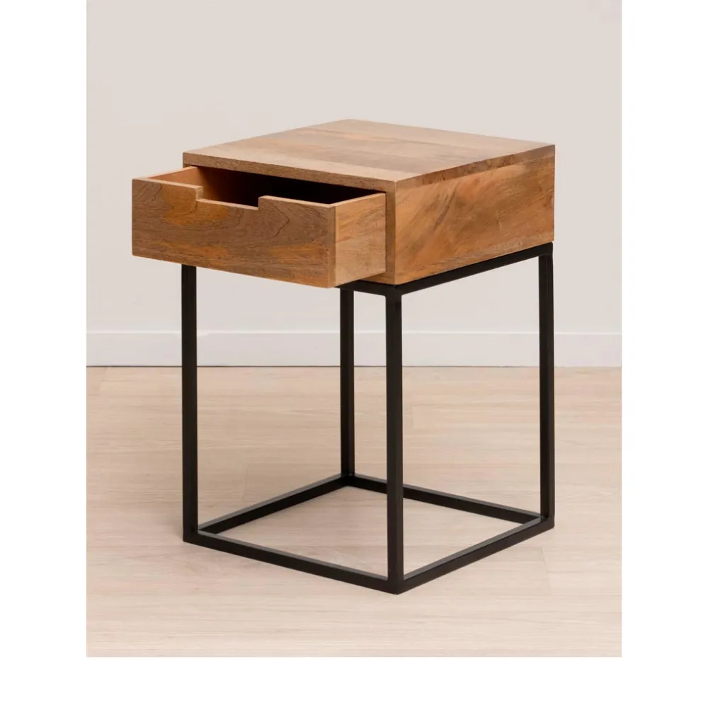 La mesa de noche Liam de la marca Chehoma es una opción elegante, fabricada en madera de mango y patas de hierro negro. Diseñada en un bloque compacto y sin tirador, su diseño bajo y dimensiones pequeñas la convierten en una mesita ideal para espacios reducidos. La apertura del cajón se facilita mediante un hueco integrado, mientras que las patas de hierro negro aportan un contraste moderno. La madera exhibe hermosas vetas naturales, añadiendo un toque distintivo a cualquier ambiente.