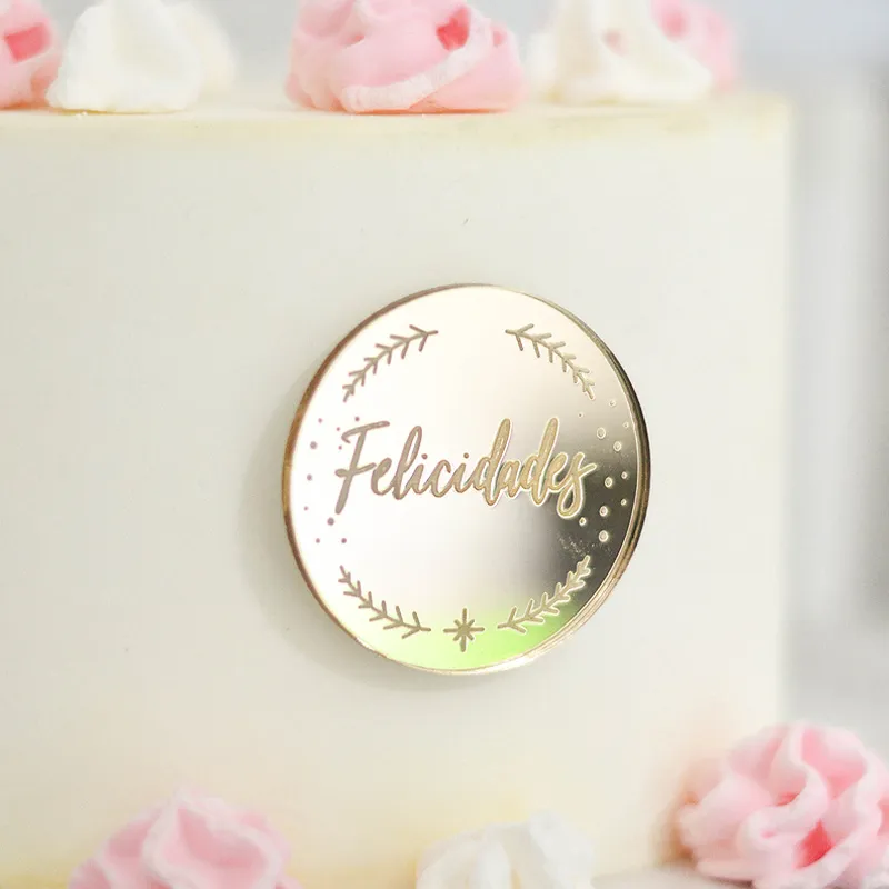 Fabricados en acrílico espejo con forma circular y diferentes frases y motivos grabados, como aparece en las imágenes.