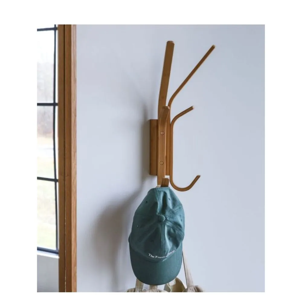 El perchero de pared Duo de la marca Hübsch está fabricado en madera de bambú, conocida por su resistencia, ligereza y flexibilidad. Con un diseño de acabado natural, este perchero añade un toque fresco y orgánico. Cuenta con seis ganchos, lo que proporciona múltiples opciones para colgar ropa, bolsos u otros accesorios y ocupa muy poco espacio en el hogar.