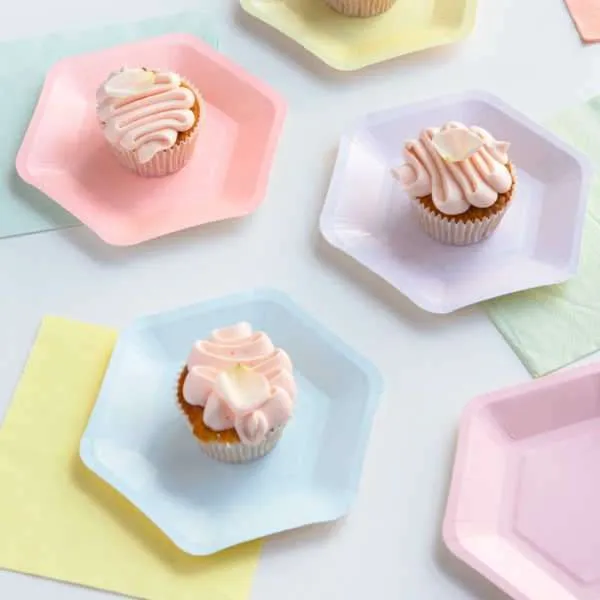 Nuestros Platos pastel son ideales. Combinan genial con muchísimos de nuestros diseños. Tienen unos tonos relajantes y perfectos para fiestas en tonos suaves. Su diseño en forma hexagonal le dan un toque divertido y te permitirán jugar para hacer diferentes combinaciones muy divertidas