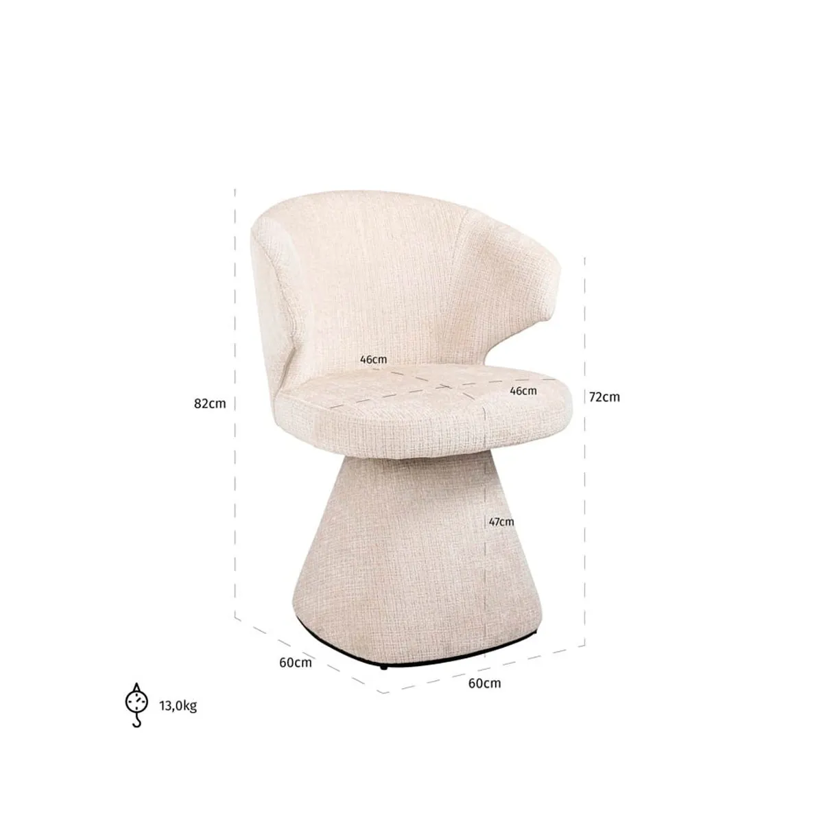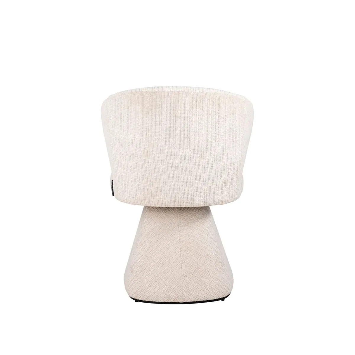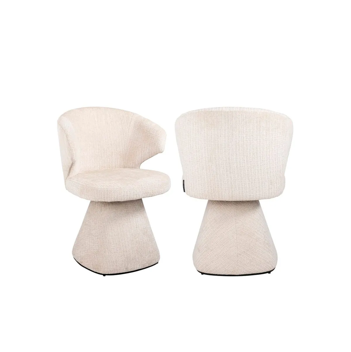 Silla Zendaya con base trapezoidal tapizad en chenilla beige.
