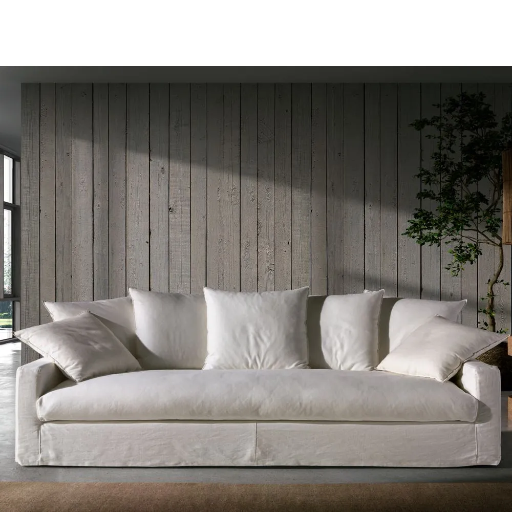 Elaborado en tela 60% algodón y 40% lino de color beige y una estructura de madera maciza con respaldo relleno de plumas y fibra envejecida distribuidas en celdas, sentada con suspensión en cincha Intes, fundas desenfundables y brazos desmontables.