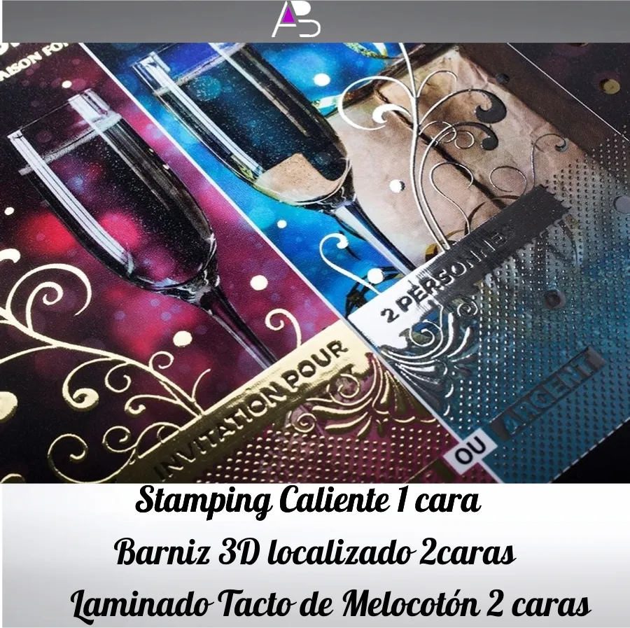 Tarjeta standard todo color 2 caras +Stamping caliente 1 cara + Barniz localizado 3D 2 caras + Plastificado tacto melocotón 2 caras en couché 350 gr semi-mate