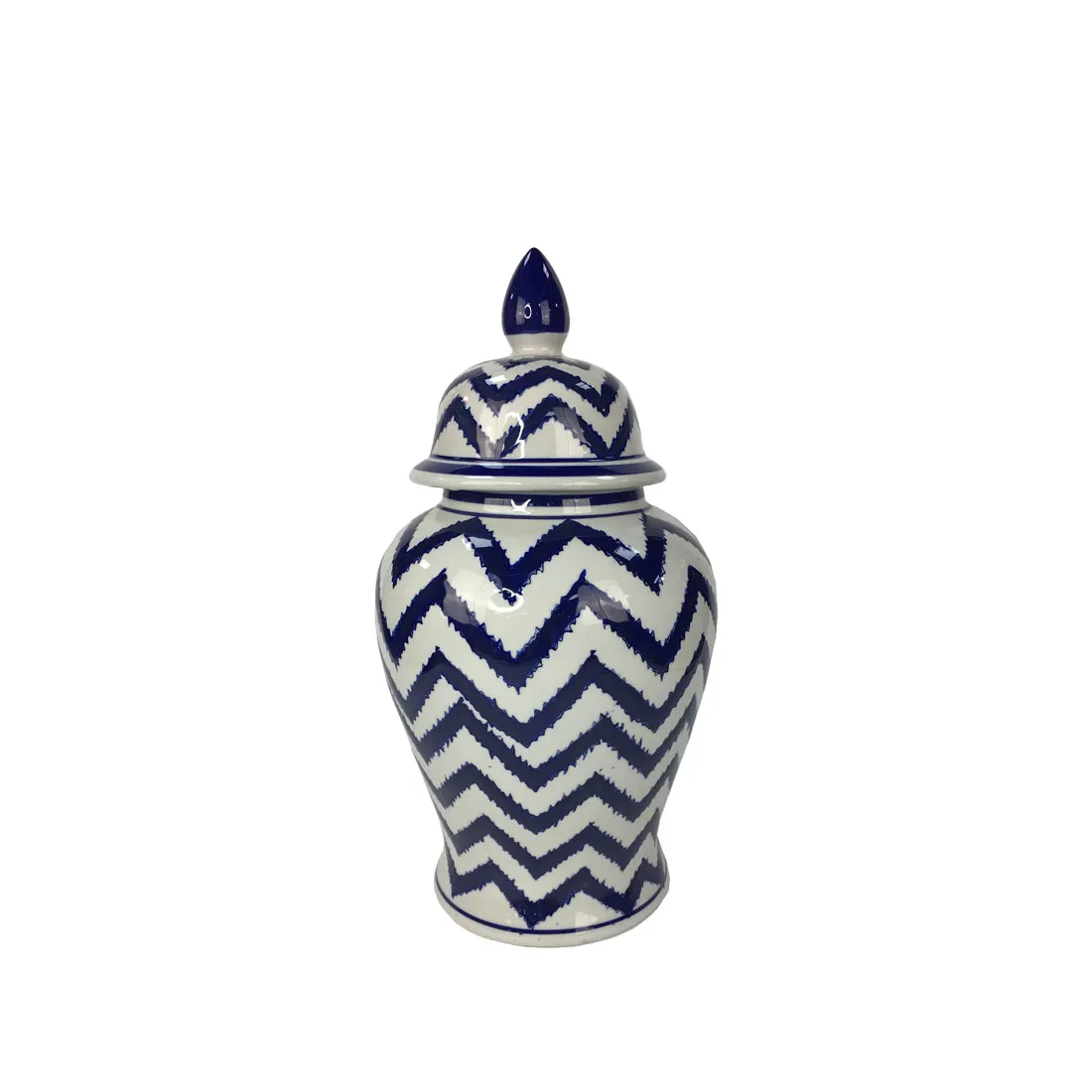 Tibor mediano con tapa de cerámica con dibujo de chevron (o espiga) en color azul y blanco.