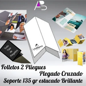 Folletos con 2 pliegues, plegado Cruz, en papel estucado brillante de 135 gr cuatricomía 2 caras