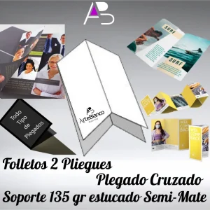 Folletos con 2 pliegues, plegado Cruz, en papel offset láser 90 gr cuatricomía 2 caras