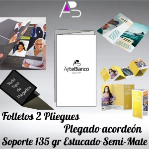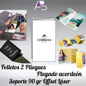 Folletos con 2 pliegues, plegado Acordeón en papel offset láser 90 gr cuatricomía 2 caras