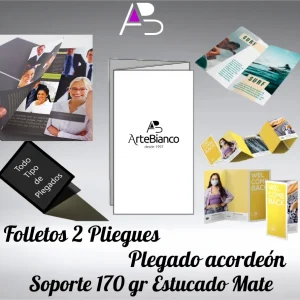 Folletos con 2 pliegues, plegado Acordeón, en papel estucado mate de 170 gr impresión cuatricomía 2 caras