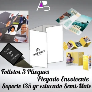 Folletos con 3 pliegues, plegado Envolvente en papel estucado semi-mate de 135 gr cuatricomía 2 caras