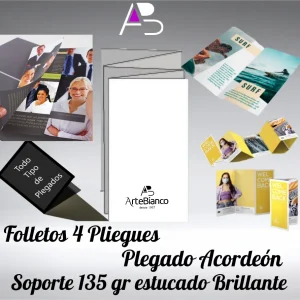 Folletos con 4 pliegues, plegado Acordeón en papel estucado brillante de 135 gr cuatricomía 2 caras