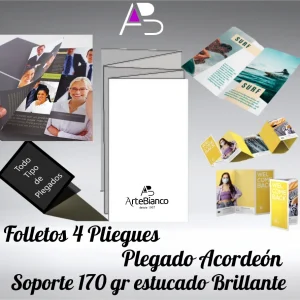 Folletos con 4 pliegues, plegado Acordeón en papel estucado brillante de 170 gr cuatricomía 2 caras