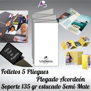 Folletos con 5 pliegues, plegado Acordeón en papel estucado semi-mate de 135 gr cuatricomía 2 caras