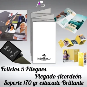 Folletos con 5 pliegues, plegado Acordeón en papel estucado brillante de 170 gr cuatricomía 2 caras